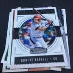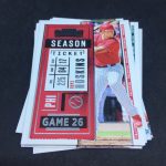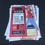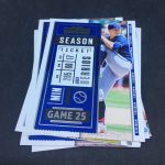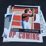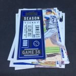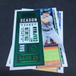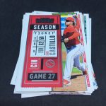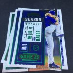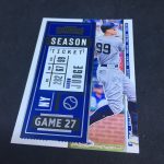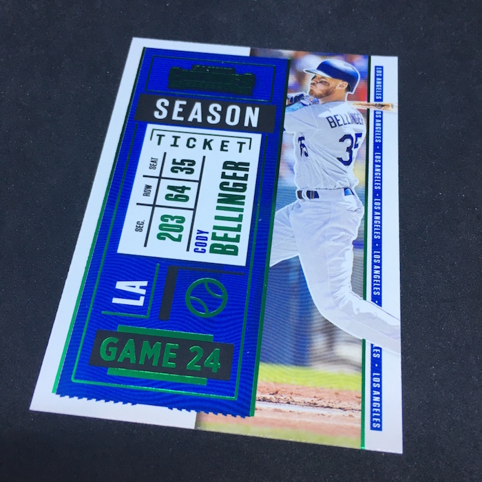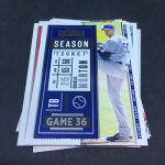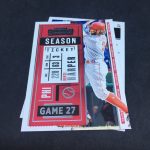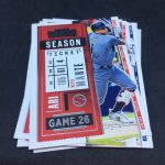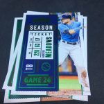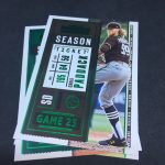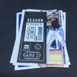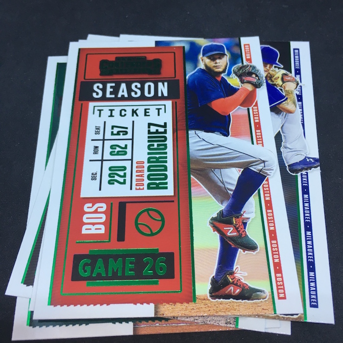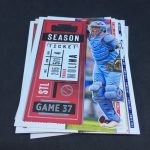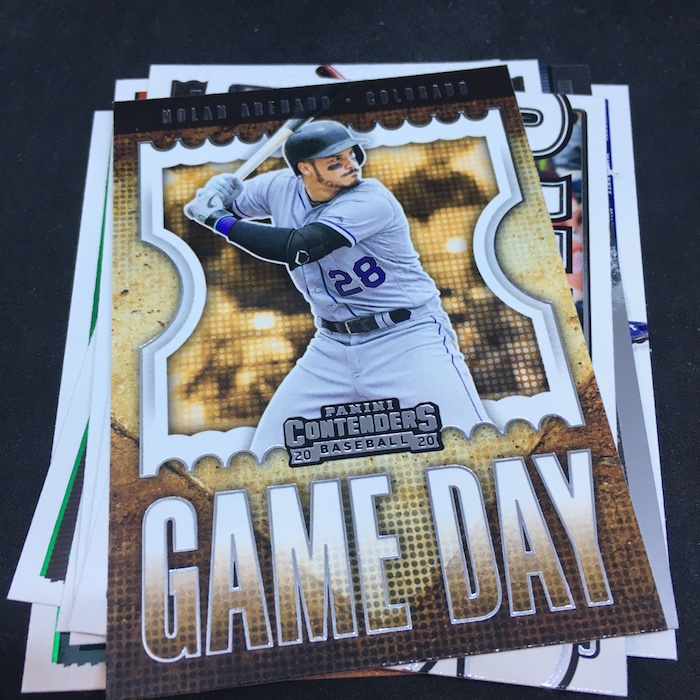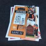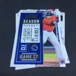What's Buzz-worthy: Contenders is back without "draft picks" as part of its name and that means big-leaguers in the main set and then rookies and other newcomers among the autographs that are found one per box in blasters here and a few times in hobby. That's a plus as the rookie crop will mean some strong ink highlights here for sure. My box was a auto redemption in my final pack but that wasn't what threw me off here -- two big things here on the design side did. A lot. The front of these cards is 60 percent the ticket element and just 40 percent the player (I literally measured it) and it feels way too overwhelming. Then throughout the release on the card backs the main font is small, all-caps and bold/dark which seems to make it unreadable in most instances. (Check out the second image in the gallery ... and then consider how that would look at actual size.) The insert lineup offers some needed variety and the one design that some people out there might hate -- the Future Stars set -- uses some typography in big, bold ways. I appreciate that and it's dynamic look breaks it out from the rest of the pack. The Game Day insert, while simple, also stands out visually from the rest of the box. There's a lot to be found here if you rip into some hobby boxes -- and those include an autograph in every pack (with 18 cards per) -- but going off what I see here I'd probably go that route. It could pay off well with rookie autos, rarer parallels and more that should flow pretty well.