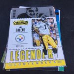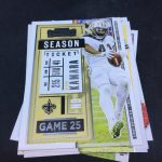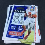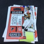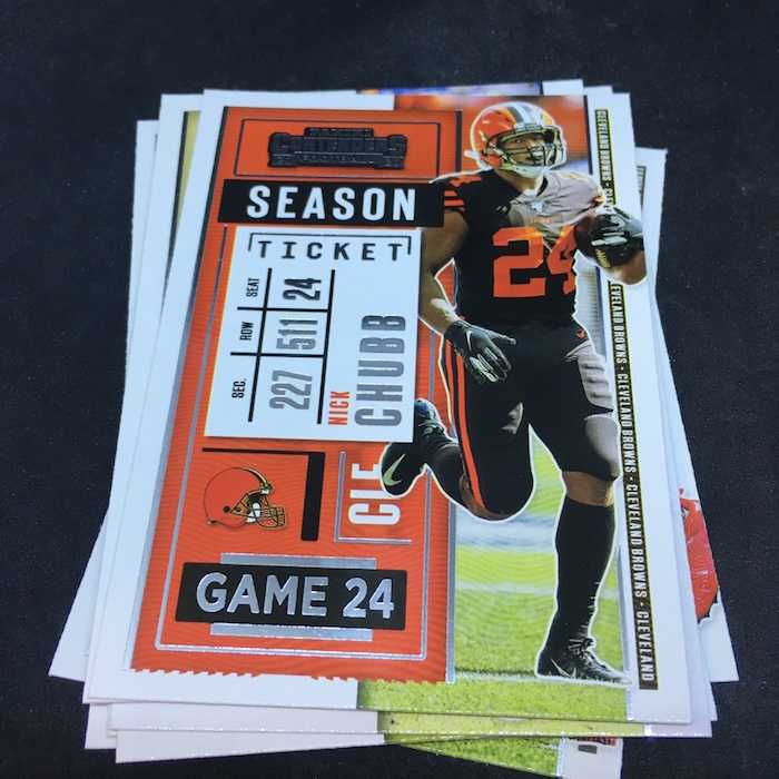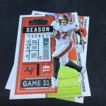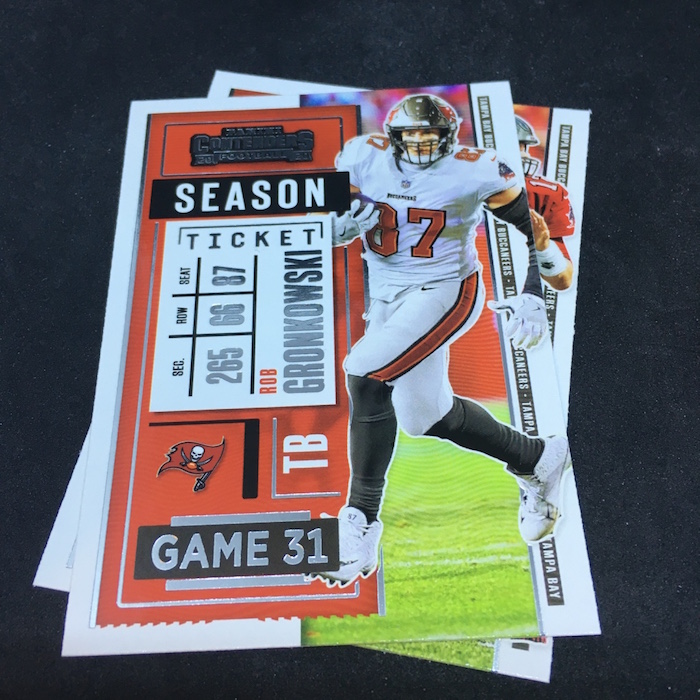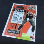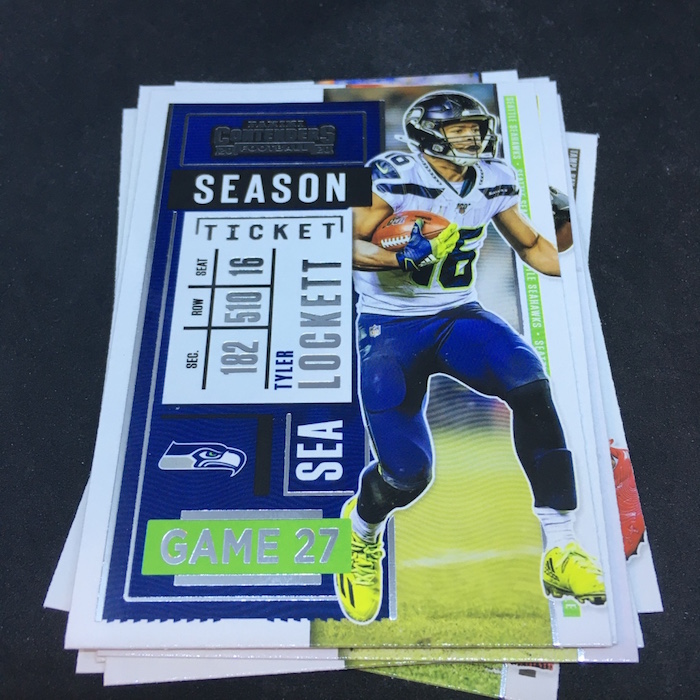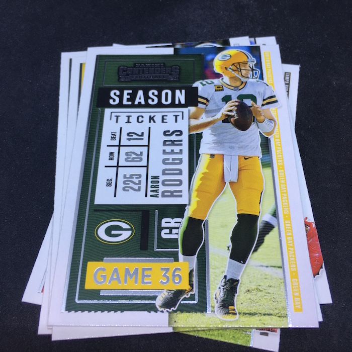 What's Buzz-worthy: Breaks of this one in these small boxes can be hit and miss with so few non-base cards -- just six out of 40 -- but this one still felt pretty good in those spots but not flashy enough for me to give it an A. It's not lacking it just needs more oomph and that's something I could say (and probably have) about these blasters for a few years. As noted last time, the inserts look good this year -- they are crisp and clean if you ask me -- and there needs to be more of them. The Rodgers MVP card here is very nice as are some of the insert sets and those hoped this box out a lot. For the base ticket design, that ticket box is just too overwhelming -- I said the same on the baseball release -- though it looks better here with some stronger photos (more to choose from) and team logos in the design. The weird hard-to-read thick font is back on the backs of these but those card backs do look pretty solid with a stat line and longer blurb than seen in many releases these days. Given this brand's consistency, really the only thing that bugs me this year vs. others is the thickness of the ticket vs. the player on the front and the back type on the back. All in all otherwise, this one is one that will be shredded hard (and already has its retail boxes being botted hard and flipped hard online) for the ink from a solid crop of rookies. Contenders autos are always popular and that's the focus of many collectors here.