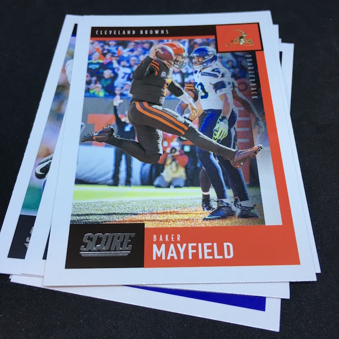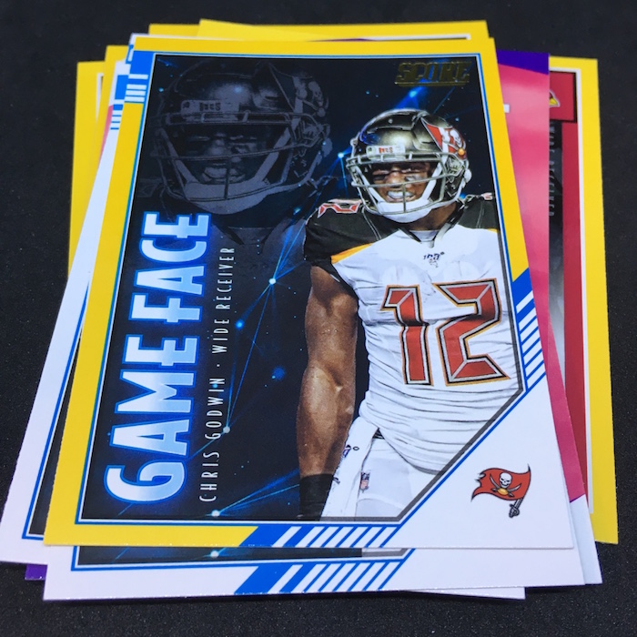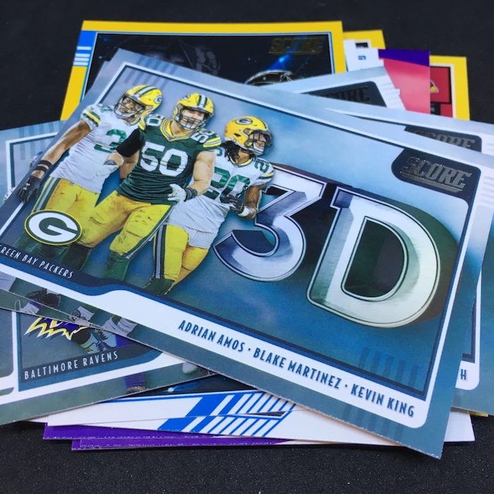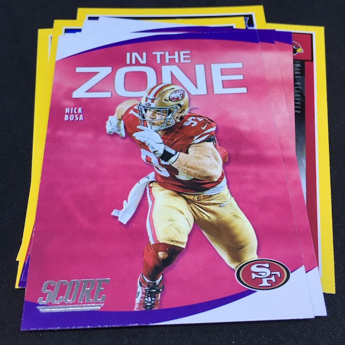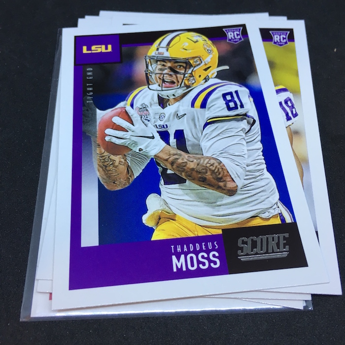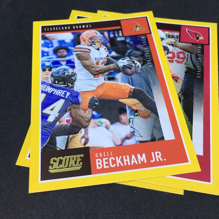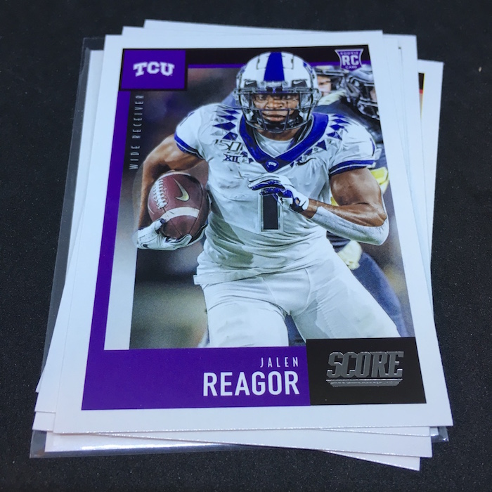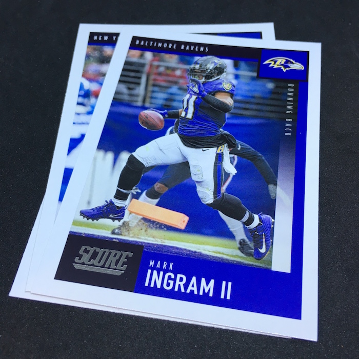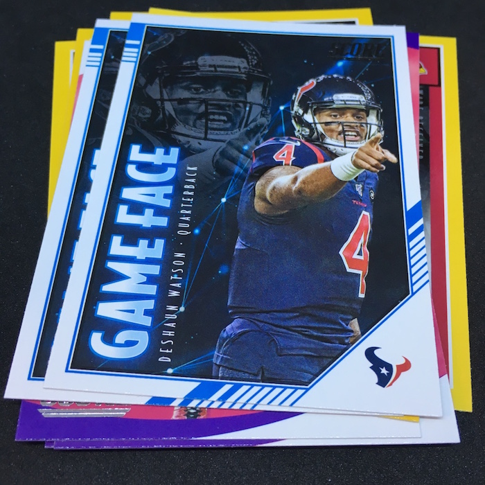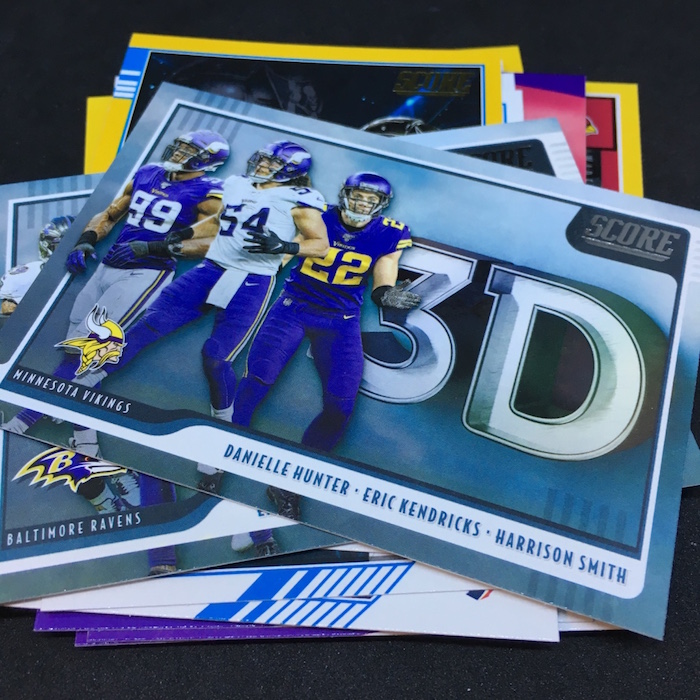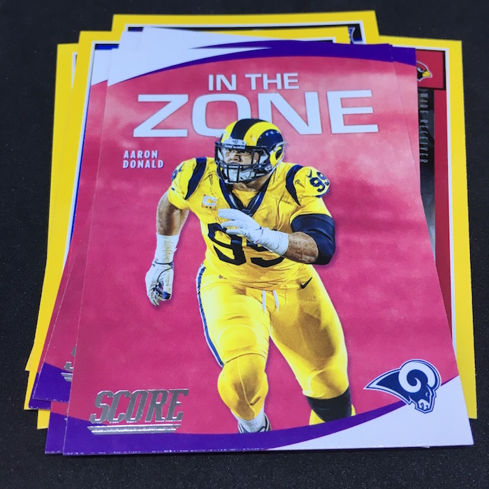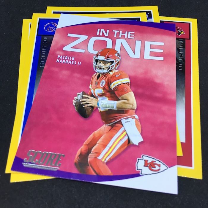 What's Buzz-worthy: You're not seeing double on those Rookie Cards -- my second blaster of this one delivered the same crop of RCs as my first and that's not a bad thing as it includes one guy definitely on my want list this year. Ultimately these boxes are consistent in what they deliver so I'm not sure I have a lot of other thoughts beyond last time. As said before, this one can include some very strong photos in those semi-heavy frames and a deep checklist offers up looks at players you won't find elsewhere during the football-card season. The inserts can be a highlight here in a box that includes a hit every time -- with ink possible -- at a price that's about the same as a single hobby pack right now (those offer a very strong shot at ink and plenty more). ... The base set's backs also include some fun details as their stat lines and bios are joined by a "fun fact" -- check out the gallery for a few of those oddities. About the only thing I think is missing here is a college notation for the veterans but most of the other necessary basics are found here. The hot rookie class will make even these vanish fast, though they are still noted with college teams here. All in all, it feels about right for a Score release and it's likely a simple release I'll dabble with more.