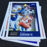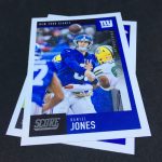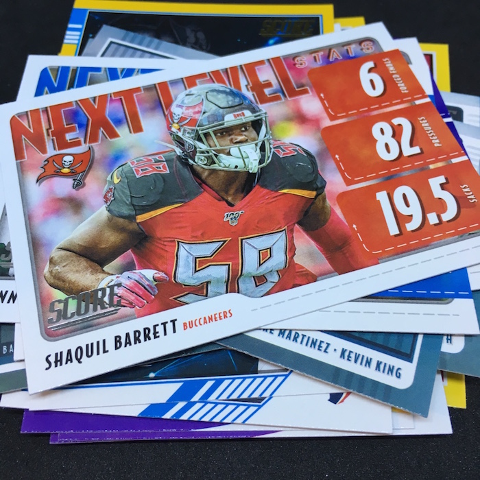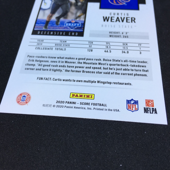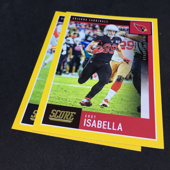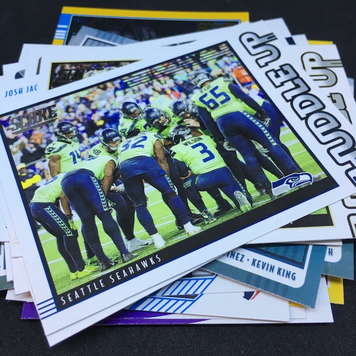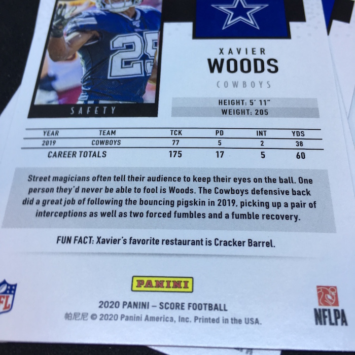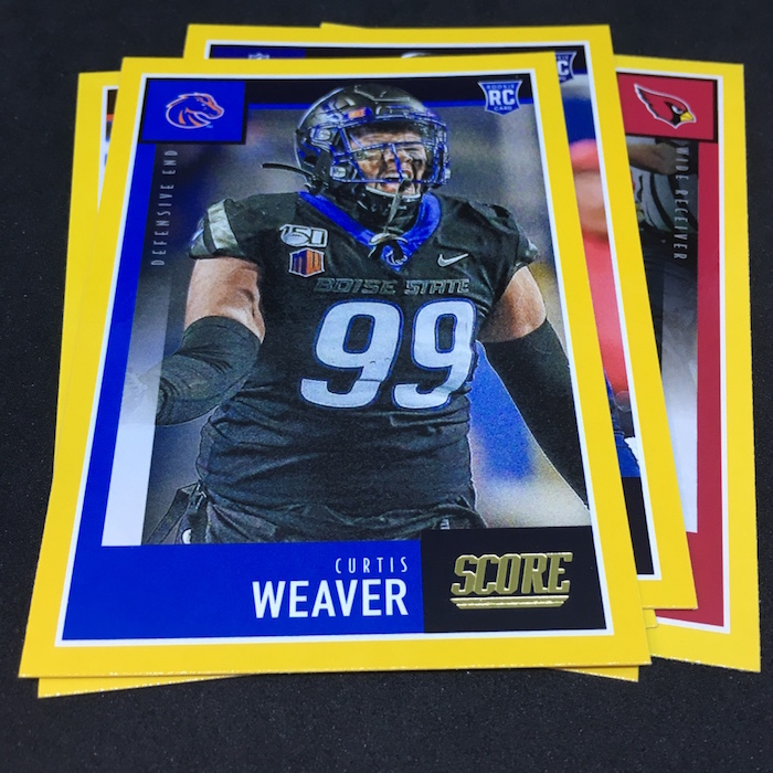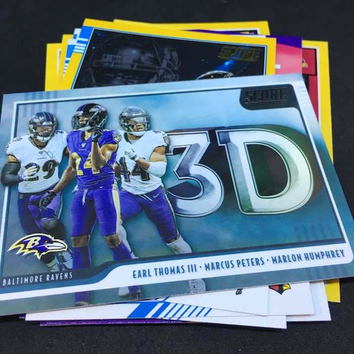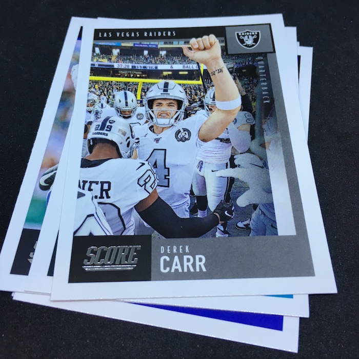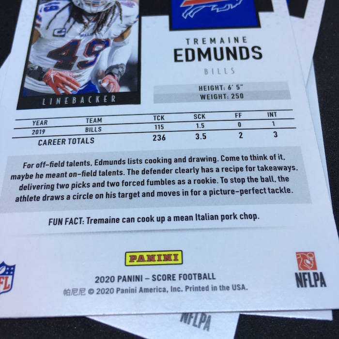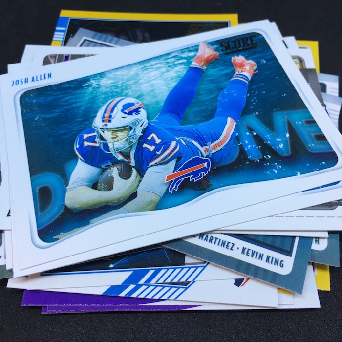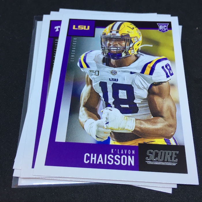 What's Buzz-worthy: You're not seeing double on those Rookie Cards -- my second blaster of this one delivered the same crop of RCs as my first and that's not a bad thing as it includes one guy definitely on my want list this year. Ultimately these boxes are consistent in what they deliver so I'm not sure I have a lot of other thoughts beyond last time. As said before, this one can include some very strong photos in those semi-heavy frames and a deep checklist offers up looks at players you won't find elsewhere during the football-card season. The inserts can be a highlight here in a box that includes a hit every time -- with ink possible -- at a price that's about the same as a single hobby pack right now (those offer a very strong shot at ink and plenty more). ... The base set's backs also include some fun details as their stat lines and bios are joined by a "fun fact" -- check out the gallery for a few of those oddities. About the only thing I think is missing here is a college notation for the veterans but most of the other necessary basics are found here. The hot rookie class will make even these vanish fast, though they are still noted with college teams here. All in all, it feels about right for a Score release and it's likely a simple release I'll dabble with more.