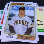 What's Buzz-worthy: This one has come and gone quickly in my area but I did find this straggler, so I grabbed it. It was an improvement over my first box of the year with some better RCs and an insert appearance from perhaps the best rookoe of that bunch, too. The set is loaded with past and present players -- a plus -- and these boxes are consistent in what they deliver for the most part. Your odds aren't great here with small boxes -- a hobby box is much safer with guaranteed ink -- but it you are a collector of Heritage this one has a serious feel of that but with more variety. As I mentioned last time, the design of this box is reminiscent of some past Topps Heritage releases in its colors and design and that vibe translates into the stock here -- it's Heritage stock on everything. ... There are, oddly, some subsets that are numbered with the main set but feel like inserts and then some inserts that use past designs, too. This one is becoming more and more like a "Topps Herchives" release and that might not be a bad thing as Heritage marches into the 1970s. ... There are a lot of variations to look for (see the checklist and check your codes) mostly on the 1955s where the smaller action shot is either a different image or a black-and-white one. The 1974s include nods to the variations where Topps had the Padres moving to Washington and the 2002 is a variation where you'll need to check the photo on the back. Odds-wise, parallels here don't flow well at all -- one in 39 packs for the easiest -- meanwhile autographs are one in 10 blasters for the easiest of them, though maybe easier overall as there are a few auto sets.