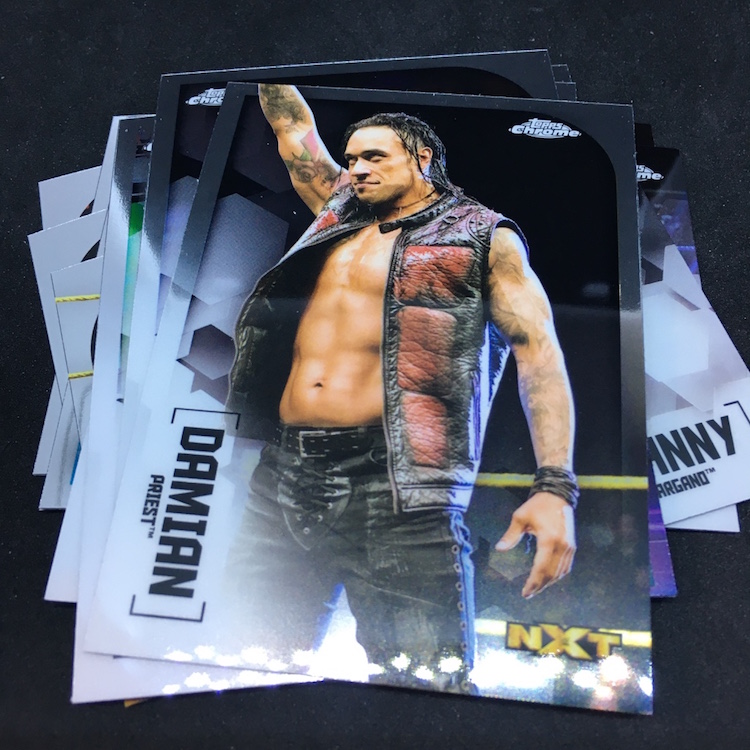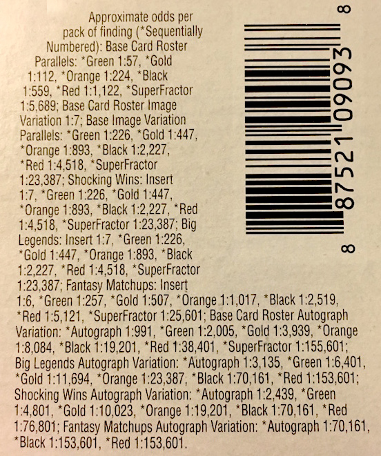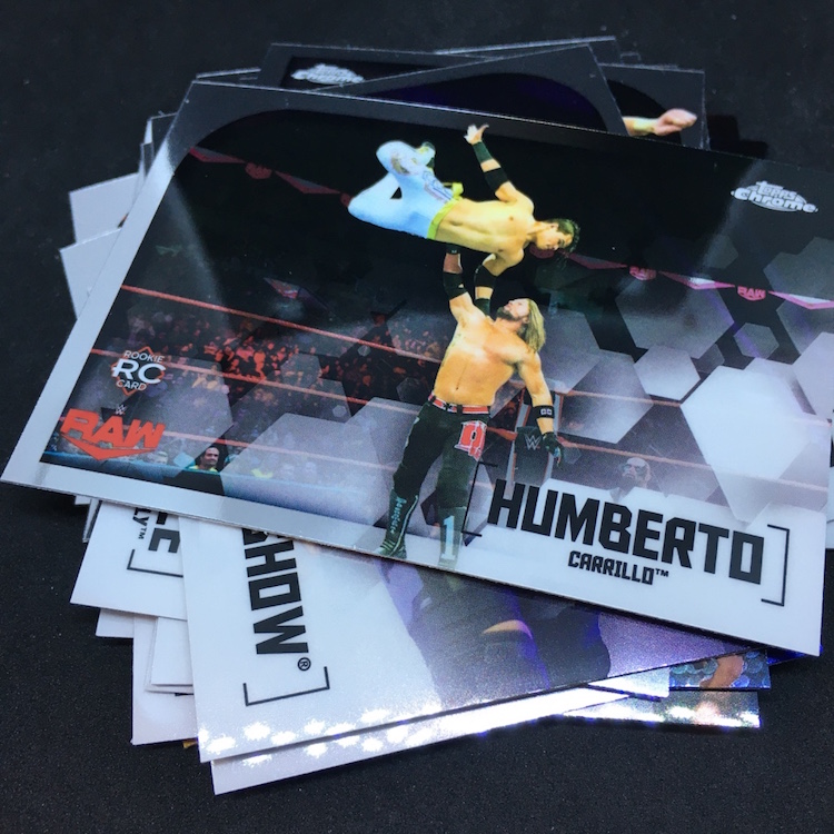 What's Buzz-worthy: Chrome returns to the WWE for the first time in five years -- that's a good thing -- but the odds of landing much more than what you see here in a blaster is not good at all. That just makes hobby boxes -- that have two autographs and more every time -- the far stronger buy. You get a standard Refractor in every pack here -- that's great for ripping and collecting but will hurt their values -- but if you want other colors in blasters they start at one in 57 packs. (X-Fractors are a bonus pack here.) Autographs? Those start at one in 991 packs here ... but the rainbow goes all the way up to finding Superfractors here if you're a super-lucky ripper. The image variation cards here are one per blaster and they are on Refractor stock with a full array of parallels, too. See the odds on those and everything else in the gallery. This one gets a top grade from me for what's in the overall release -- it's small but it's a well-designed Chrome effort -- and I will be ripping into hobby boxes of this one as that is the best way to go by far with aye autographs per. The odds here should not be too shocking for those who did Chrome in its last run -- 2014 and 2015 -- as the retail odds there were just as brutal but with stuff in blasters at long odds then, too. What's different? There were not two autos per box back then and I'm not sure even one is guaranteed in hobby. (I ripped only retail back then as I don't think ink was guaranteed for the higher-priced box.) ... Interestingly the "first NXT card" logo appears to be out the window as RC logos here are found on the first-time NXT stars in this set. That's a good move as they are part of the base set ... so they should say RC. (NXT cards have been both inserts and in base sets in past so this fixes the inconsistency of the logo usage. If they are in the main set, they should be RCs.) ... This box had some repeating parallels and that paid off here with a couple of names I'd want to see but it could pay off really well if you were to land some newcomers here in those spots. The photography and the design are both strong here and the color, when you find it, looks really good. I just wish the odds in blasters were. I will be ripping hobby right here soon.