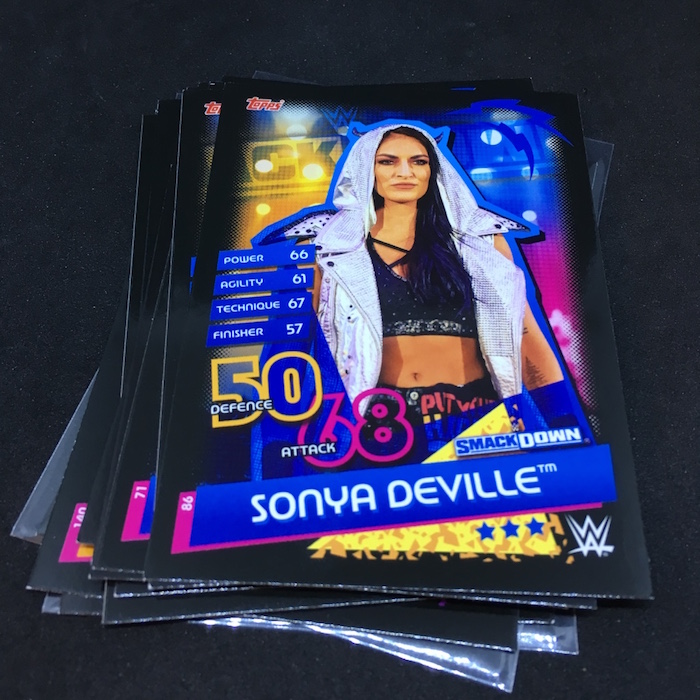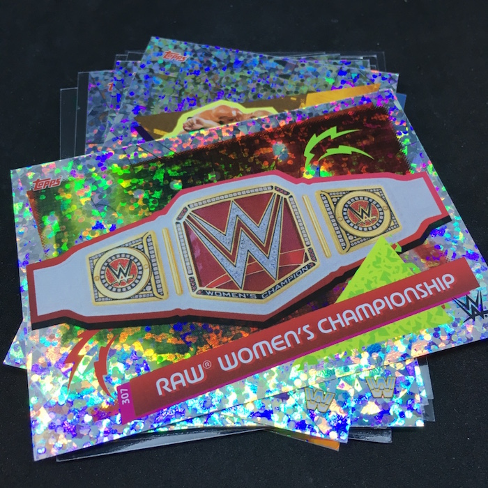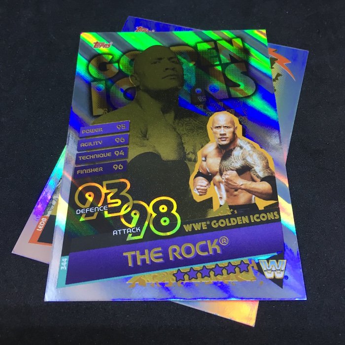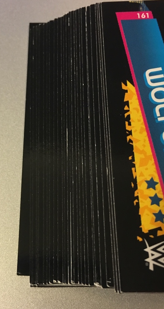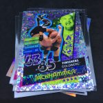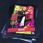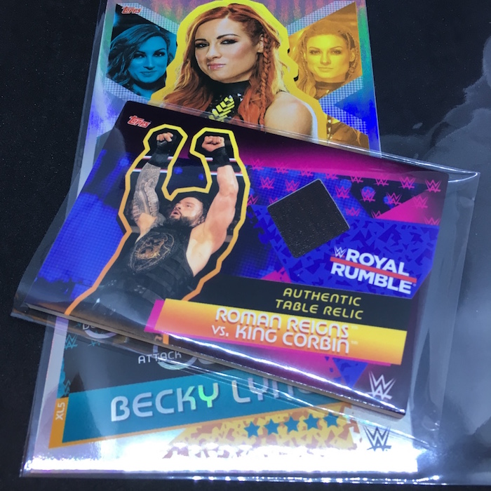 Just 312 tins of this one were sold via Topps' UK site and (spoiler) I landed two of them with Relics. This is a unique one and teaser of something to come later this year as it has a piece of a broken table from Roman Reigns' match against King Corbin at the Royal Rumble. The overall feel of the inclusions? An A+ thanks to that and other cards. These are very striking with a definite 1980s pop vibe and slick new design. The F-caliber bummer here? The packaging in tandem with the thin stock and black edges on the fronts and backs. Yes, they are gaming cards -- so some out there won't care about condition and will just play them -- but the jumbo card pack literally bounces around the tin (and one smaller different tin I bought had the same issue). Nearly all of the cards have corner issues or spots on edges -- a big bummer -- and some are really bad. What's the easy fix for Topps? Cut the cards with rounded corners -- they are gaming -- or pad the tins ... or use a blob of adhesive goo in the bottom of the tin and lay the pack on it.