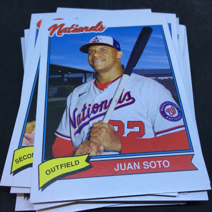 Base cards – Ken Griffey Jr., Fernando Tatis Jr., Ichiro Suzuki, Robin Yount, Tony Gwynn, Manny Machado, Christian Yelich, Alan Trammell, Al Kaline, Cal Ripken Jr., Eddie Murray, Jim Palmer, George Foster, Trevor Bauer, Nolan Arenado, Nolan Ryan, Mike Trout, Albert Pujols, Shohei Ohtani, Jackie Robinson, Anthony Rizzo, Dave Kingman, Ryne Sandberg, Juan Soto, Max Scherzer, Mike Schmidt, Steve Carlton, Jim Rice, David Ortiz, Ted Williams, Carlton Fisk, Willie Mays, Matt Olson, Rickey Henderson, Reggie Jackson, J.R. Richard, Justin Verlander, Dwight Gooden, Darryl Strawberry, Pete Alonso, Sandy Koufax, George Brett, Babe Ruth, Hank Aaron, Aaron Judge, Derek Jeter, Tim Raines, Andre Dawson, Gary Carter, Clayton Kershaw, Giancarlo Stanton, Gerrit Cole, Dale Murphy, Dusty Baker