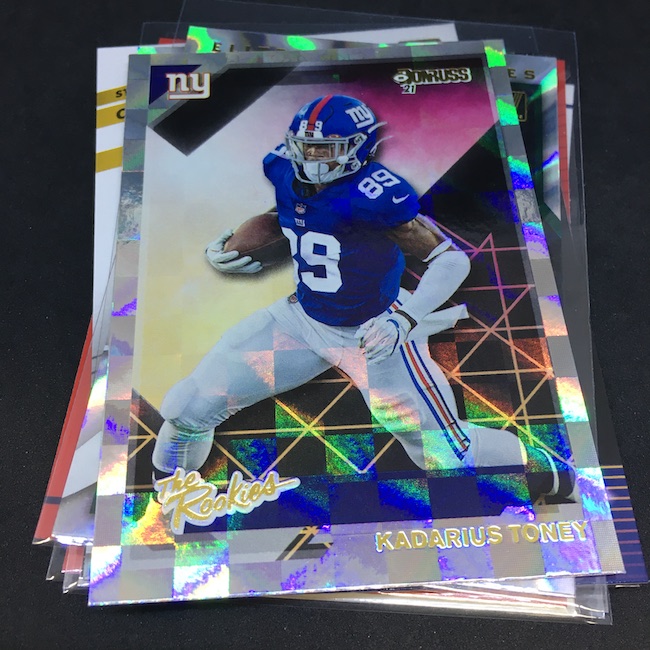 What’s Buzz-worthy: This straggler was left for the kids and I qualified as one of them by making it mine despite its $20 price tag at my retail stop. It's just my fourth pack of this one this year -- a record low due to the ability to find them and then perhaps the higher SRPs this year. (Mostly due to the ability to find them.) The RC volume here is basically the same as the jumbo pack format but you get nearly double the inserts and foilboard-style cards are a lot more plentiful here. (That part actually does feel like it's worth the higher price.) I landed one of the better names but not the biggest names with the Najee Harris Rated Rookie -- though it's got a soft corner -- which makes this one better than all other packs I've opened on the RC front ... but none elite. The base run here was very rough even with the higher volume of cards while the inserts helped even things out -- but not enough star power to get it an A-level grade. (It's not bad ... just no obvious "big" here.) ... Autographs do appear to be in the mix in this format though I suspect they aren't the norm, meanwhile there are "ultra rare" blue Optic Rated Rookie Preview cards only found in these packs as well as green Rated Rookie autos, too. (Neither this time.) All in all, this one was comfy but not great -- and that's a little unfortunate as I think Donruss and Optic have been among the better releases of the last few years for NFL basics. One thing that might make me rip more or help values of stuff here that's rare but not obvious? Posting some odds on the boxes ... it feels like it might be time to do that even if the print runs are higher due to more popularity with NFL Rookie Cards.