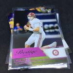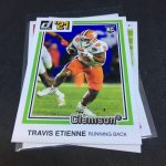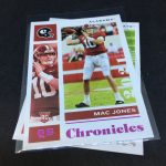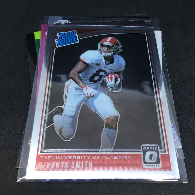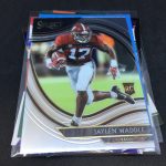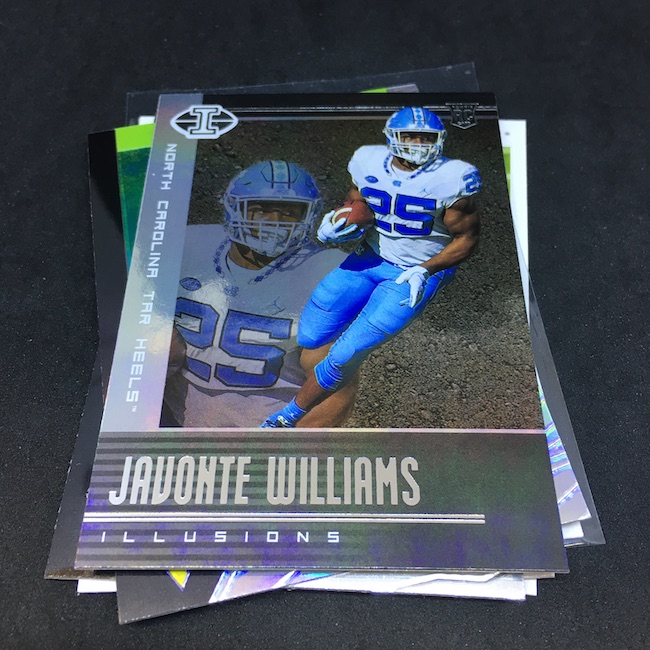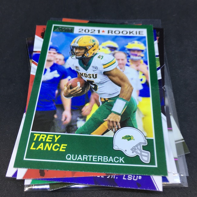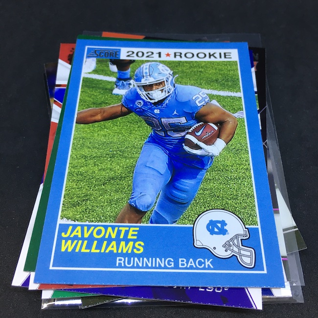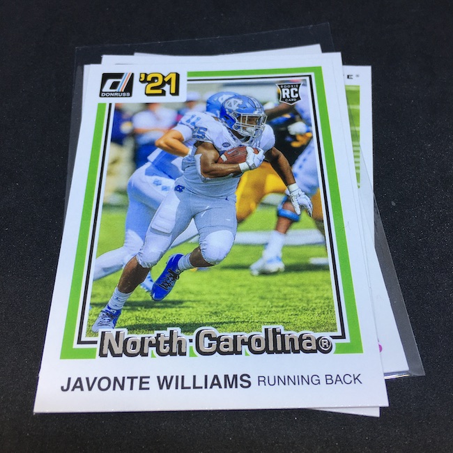 What's Buzz-worthy: No ink this time ... but I still got some good volume on players one would want to see here along with some stars with school ties for me so this blaster is still an A- box to me after paying suggested retail price. Trey Lance, Mac Jones, DeVonta Smith and others stood out to me here and then Javonte Williams showed up several times just in time after two of his best games as a pro. (Not that important here but it shows how you can get volume for names who could be off radars.) ... It's a Friday and I still have other stuff to prep, so I'll let some of my thoughts from last time finish up here ... If I were forced to name my top few brands of the last few years for football as a collector this one would be a contender for a top spot. Why? The variety, the star power and the runs that can happen even in a tiny box like this one. The brand's all-in-one approach that gives you a small volume of players presented in several different brands all in one spot -- a formula that's fun and can deliver big if you land the right names over and over ... in any sport. Numbering-wise, it's all one set but to me it feels like a Chronicles base set and then the rest feel like inserts because of the variety of the stock and looks. Pink parallels and Prizm parallels are the inserts here and you get a few in these boxes -- but other colors and a ton more in other formats so you should consider them (hit that link up top). Over time the easier pulls found here will get cheaper -- no doubt -- but the quality of stuff here simply from a collector standpoint is unmatched, especially if you're a college football fan. If you're collecting or not all that worried about cash returns, rip these all day long ... they are a lot of fun. If I could find them in-person at volume at SRP, I'd rip a lot more than I have.