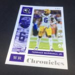What's Buzz-worthy: This is a fun one and I grabbed it, though it's not new at this point at all, at SRP to revisit it one more time -- and truth be told it probably won't be the last time I do it. Why? Well, it's not because of the ink -- I landed one this time though his card didn't say much about him -- but it's about the name power here and the ability to stockpile good names or players from your school if they are in there on the cheap while getting some ripping in. ... As I said before, if I were forced to name my top few brands of the last few years for football as a collector this one would be a contender for a top spot. Why? The variety, the star power and the runs that can happen even in a tiny box like this one. The brand's all-in-one approach that gives you a small volume of players presented in several different brands all in one spot -- a formula that's fun and can deliver big if you land the right names over and over ... in any sport. Numbering-wise, it's all one set but to me it feels like a Chronicles base set and then the rest feel like inserts because of the variety of the stock and looks. Pink parallels and Prizm parallels are the inserts here and you get a few in these boxes -- but other colors and a ton more in other formats so you should consider them (hit that link up top). Over time the easier pulls found here will get cheaper -- no doubt -- but the quality of stuff here simply from a collector standpoint is unmatched, especially if you're a college football fan. If you're collecting or not all that worried about cash returns, rip these all day long ... they are a lot of fun.