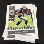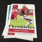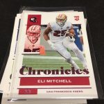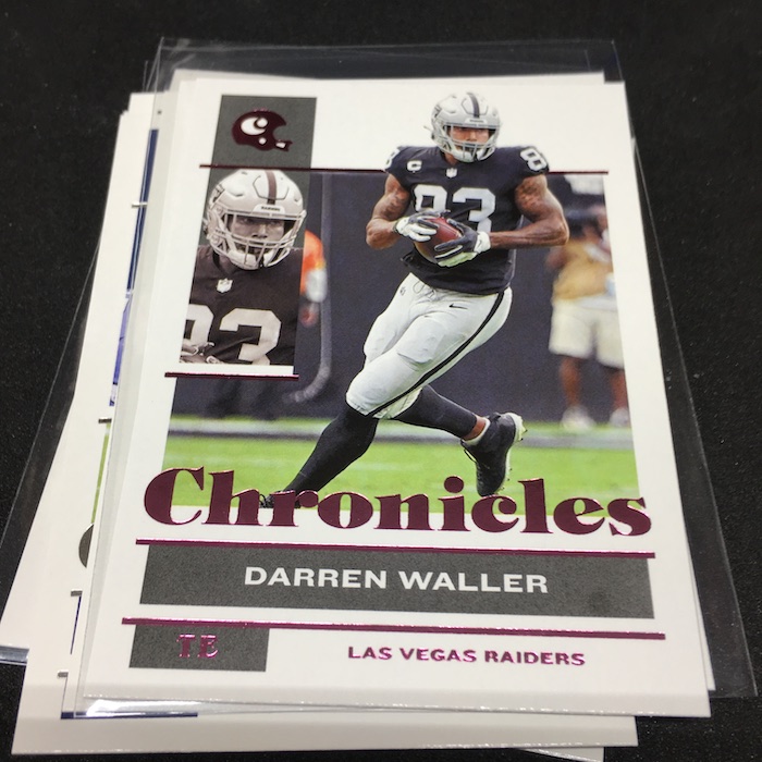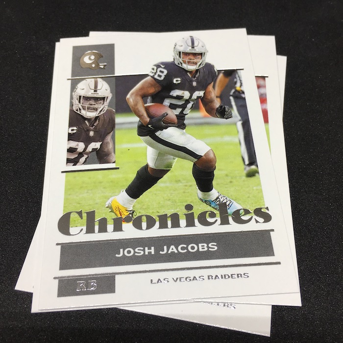 What's Buzz-worthy: I meant to grab a pair of these because it's already a favorite of mine for NFL releases this year, but I mistakenly ordered two Prestige (see how that worked out yesterday ... a 1/1). This one? It continued to deliver for me with Optichrome-stock cards of Mac Jones and Najee Harris -- two guys I'd personally be looking for among the crop here. Also in play making this a very good box? Tom Brady appearances, Trevor Lawrence appearances, Justin Fields and some Eli Mitchell action -- he came up just short of 1,000 yards last year. I dig the variety here a lot -- the acetate cards and Optic cards here make it a solid mix -- and this is one with the rookie crop that I'll definitely do more of. ... This one is right there in the Chronicles wheelhouse but the base set is bigger this time and you get more cards per box than the draft picks release for the new year. Does it work? I think so. The base set here has always been a little simple if not downright bland but in my mind I think that's to help show how the other sets are so different and, easily, better.