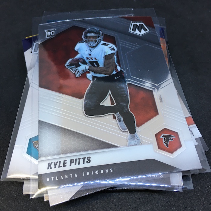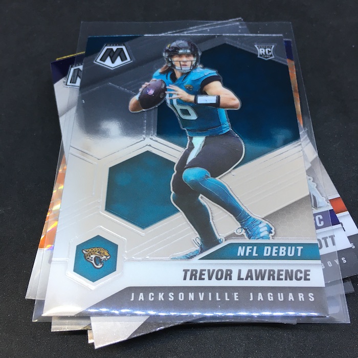 What's Buzz-worthy: Buzz got some sticker shock with this one at Walmart -- they're charging $29.98 for these -- after I had somebody grab one for me not knowing the price. Did it deliver vs. that initial perception? Perhaps with a Kyle Pitts RC and a Trevor Lawrence NFL Debut RC a bit but ... I'll admit I was underwhelmed. I think the design this year is improved over last year so that gets it a better grade but this brand that I ripped a ton of last year at a lower suggested retail price is likely a one-and-done for me this year. The Rookie Card volume here isn't bad from a 100-card run of basic RCs atop 200 cards. The subsets are pretty much broken down above save for Super Bowl MVPs and the parallels here are what these boxes are to deliver on the norm. Hangers also include rookie variations that have been the norm for Mosaic in the past. My inserts and parallels had some better names but not necessarily better value-stars for cards this time. As a casual NFL buyer -- though it's still one I buy more than others -- this one this time just didn't pack enough punch. Had this box been at a lower SRP of the past? Perhaps.