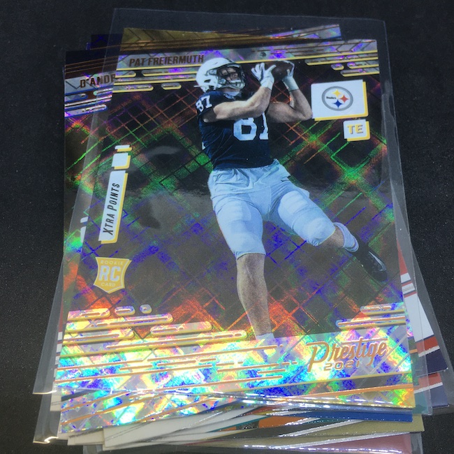 What's Buzz-worthy: My last one of these had a numbered parallel and a hit ... so this one feels like it's a lot more toward average territory in direct comparison with a couple of decent name rookies but not a ton of money right there right now. I did get some young talents among the inserts but also probably not in zones where they'd make the box an A-level rip. I do like this one for the most part for the basics, though all that white on the fronts still bugs me. ... As I noted last time, Prestige is, generally speaking, a brand I typically dig into quite a bit -- but perhaps a little less in recent years (Donruss got my low-end NFL bucks more). ... The Xtra Points Diamond parallels are only found here -- and if one is a rookie every time then there's some good value to be found if you land a top name -- and they add some flair to these breaks. The inserts' designs I generally do like though only a couple of them felt top-tier to me -- some feel like they need more touches added. A rookie in every pack is a nice feel here and that may be what I like the most, though most collectors will dig in elsewhere with NFL uniforms on RCs.