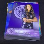 What's Buzz-worthy: I really don't have a lot more thoughts on this one vs. last time -- I still don't know more about soccer in the last few days -- but I do know that I like ripping into these as they are an interesting rip for the price ($11.98) and that you get a good amount of cardboard here. This pack? Essentially the same lineup as last time save for one insert being found twice this time (same number of cards) with plenty of new names but still not the biggest ones that are selling very well here. I did notice a few more diamond cut cards (see last card in gallery) and you can see that mis-cutting a lot if you look at the backs. (Not a big deal unless you try to grade cards here -- they are otherwise clean but that does hurt grades.) ... Some of my thoughts from last time are below. ... This is the first National Women's Soccer League trading card set from smaller publisher Parkside Cards but they have a big bold feel to them that can easily out-do any designs from other companies. The base set here is 200 cards with a small number of un-marked photo variations limited to only 100 copies in the mix along with some parallels and inserts as seen in this sampler I picked up at a Walmart. Since this release has no competition there is a lot of demand in some instances for cards from this one -- check out this search and flip to completeds. Autographs are one in 20 packs and include Megan Rapinoe for starters, while other inserts can be far rarer (See odds in gallery.) ... Trinity Rodman, Ali Krieger, Alex Morgan, Julie Ertz, Kealia Watt and a number of others are selling well here -- with ink and the SPs pricey cards. You can find the checklist here. I don't do much soccer but this one made me want to open more to see how things looked.