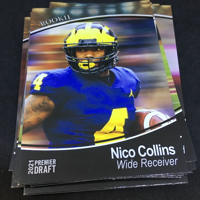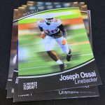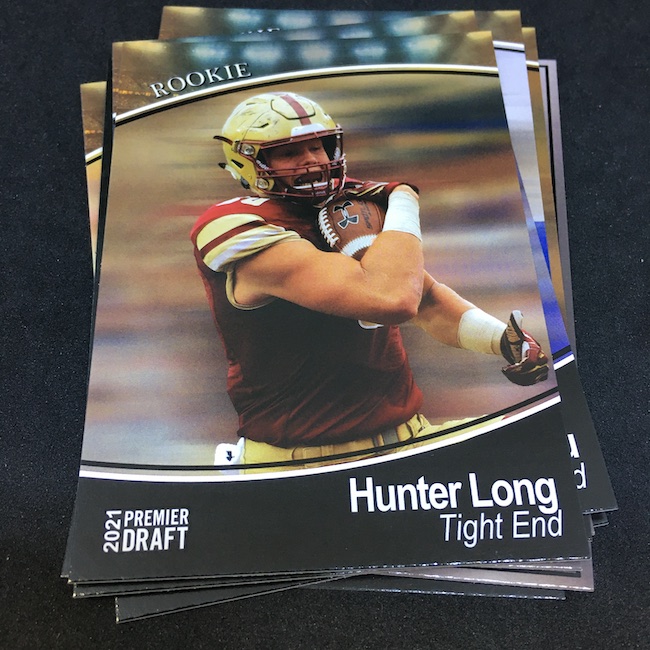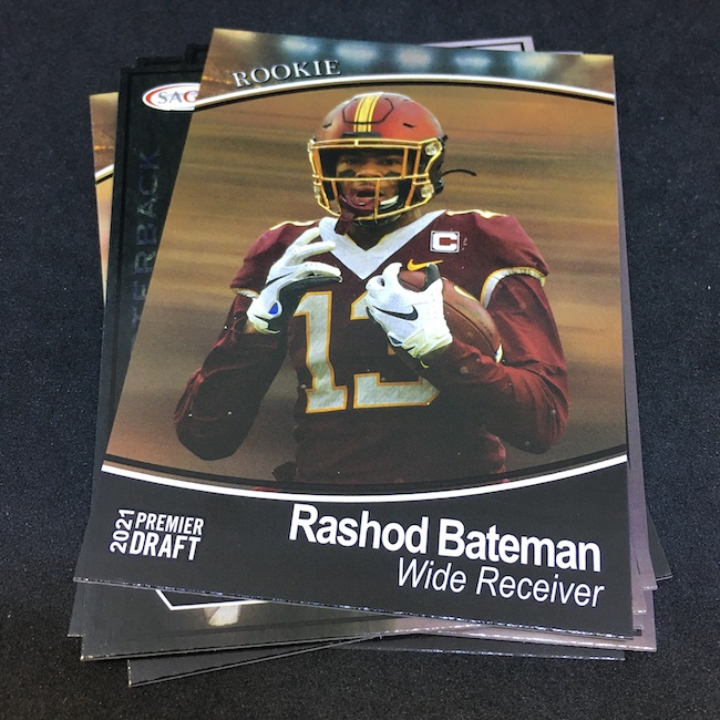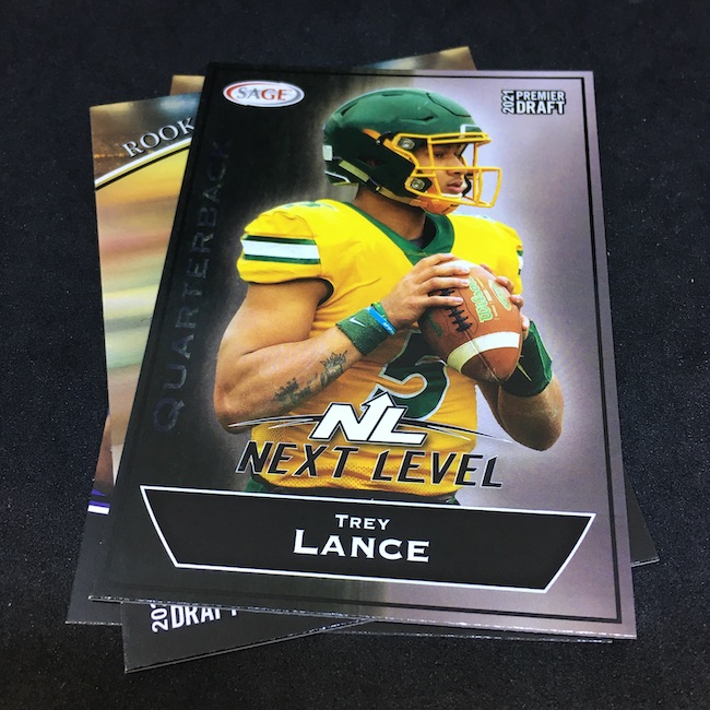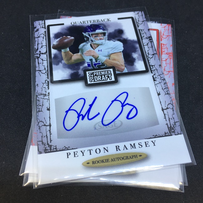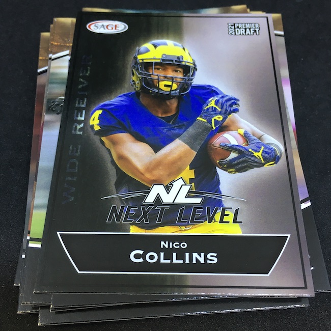 What's Buzz-worthy: SAGE's new season of cardboard follows a similar approach to last year -- a box within a box but with the autographed cards in a pack this time. The lineup here is very simple -- base cards, Silver parallels and ink -- but it's one for the more-dedicated football fans and those looking for dark horse candidates in the future. A number of players in my box went unsigned and that didn't help the flash factor for somebody like me (I'm lucky to know all first-rounders' names, let alone others) but after a quick check pretty much all guys you see below on base cards were drafted and there were others, too. So ... the box was better than I initially thought on that front. The key here is the ink -- three per box every time -- and this one included a draft pick and a signee. Was this one flashy? Well, it wasn't as flashy or as colorful as my break last year so that's what I am gauging this one on. The dark colors and no gloss here may create some challenges for condition or if you have a favorite you might grade but if you're a collector and seek out players (who will inevitably get missed elsewhere) from your team or area, this one has its moments.