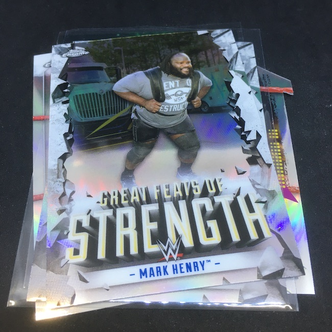 What's Buzz-worthy: After doing hobby boxes and having a lull in stuff to rip, I opted for a trio of blasters for this one at SRP and, well, it reinforced what I had been saying -- do hobby if you're looking for ink or deluxe stuff. I demolished the odds on that Green at one in 258 packs (37 boxes!?!) but, well, it's not a card that will likely pay for a box and maybe not even a pack. Standard ink here starts at ... one in 2,950 packs? (Part of me thinks that's a typo ... but that's what the box says.) The Feats of Strength inserts are exclusives here and there are autos to find at 1,122 packs -- and other autos in tandem with the inserts all do add up to find more here -- but hobby boxes have two autos every time. (Do those until they are gone.) You get a standard Refractor in every pack here with inserts and variations dropping in, too, so you get some god variety here for a small box ... but this box was the best of my three ... and not that great. ... As I noted previously I gave the somewhat minimalist design of Chrome an A+last year but I think this one is better with the pseudo-1987 Topps vibe borders (no wood) working well within Chrome but without a comic book feel that I initially feared. This one feels modern like a Chrome set should. The only drawback here is you can see how it was delayed a bit this year with a number of past WWE stars still on the checklist, giving us last shots at new cards and new ink. For more thoughts and images, check out my previous breaks.