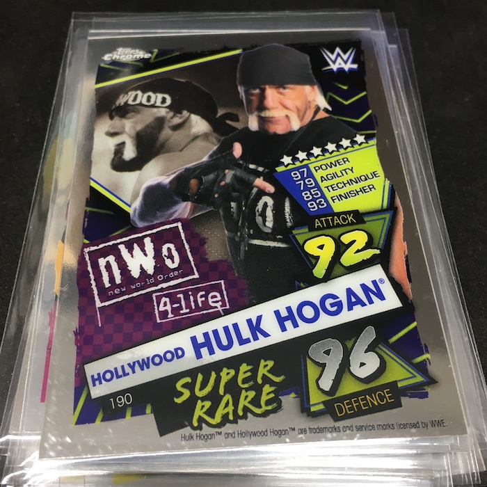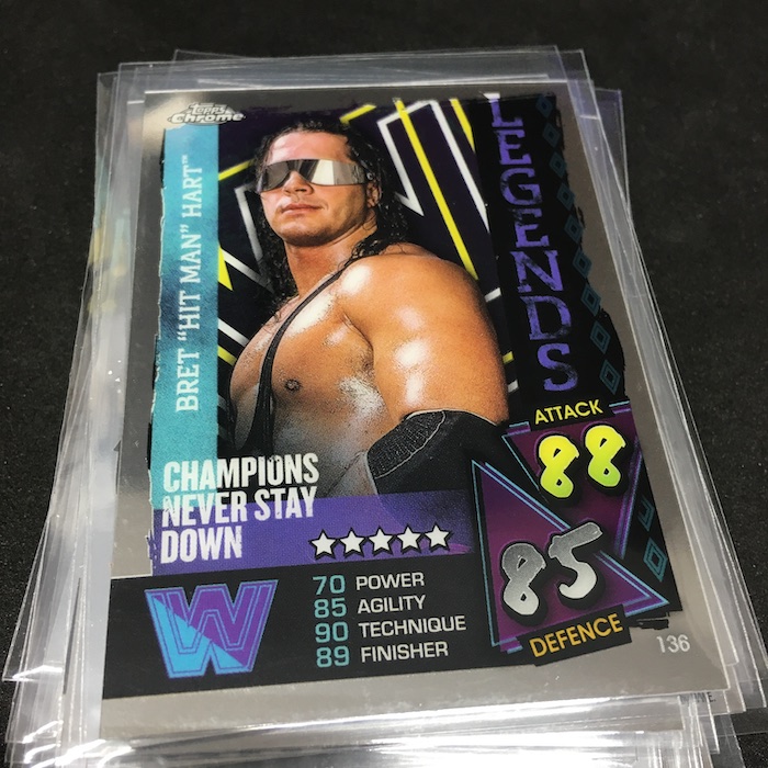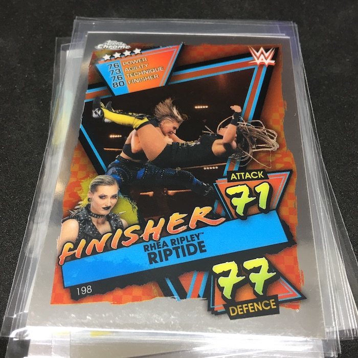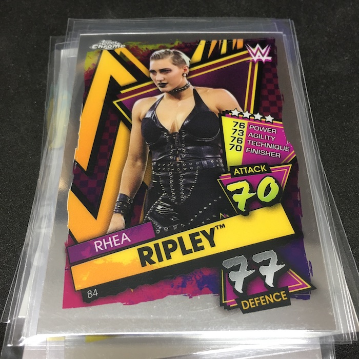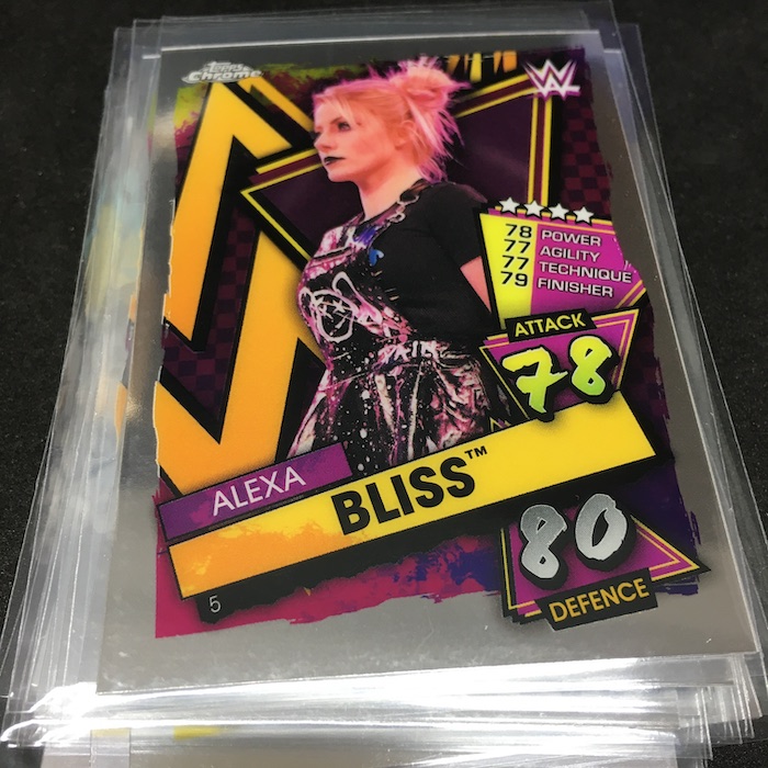 What's Buzz-worthy: What happens when you take a simple gaming approach -- stars, highlight moments and some other subsets -- and then Chrome it? The answer is in this A+ box. You get parallels in all the colors I found above along with Black (one in 73 packs) and Superfractors (one in 722 packs) and then autographs with a smaller rainbow of parallels -- Refractors, Orange, Red Wave and Supers -- and that's it. The only real drawback here? The price of a box with a lower volume of cards but no hit -- ink is one in three boxes but since this is gaming I don't hold that against this one. The visuals here are so clean -- busy but clean -- and the printing/cutting is near-perfect if not better than the standard stuff we see Chromed I still gave this one an A+ grade. ... Regular Slam Attax cards are a vibrant and affordable rip if you're just looking for names to add to your collection, early cards of new stars or a flashy rip on the cheap. They were primarily made for the UK and European market (not sold in the U.S.) and then the Topps India crew re-issued the UK version of the set with everything but hits -- at least while Topps had the license. I landed this since the price was slashed pretty hard during a Dash Deal last week and I'll probably do more if the price dips. Singles prices are stronger than you might think here and there since this one was released in the UK. This was perhaps an above-average one but I think there's a lot to be found here with an autograph checklist that includes Alexa Bliss, Hulk Hogan, Sasha Banks, Roman Reigns, John Cena, Bret Hart, Triple H, Rhea Ripley, Toni Storm, Mick Foley and more to go with all those energetic base cards and color parallels. It's a winner if you ask me.