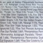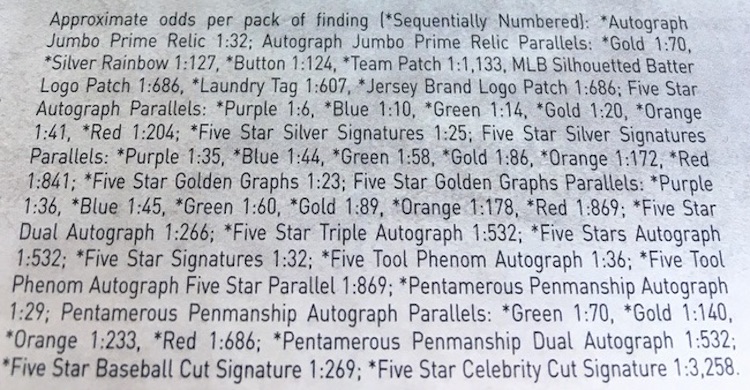 What's Buzz-worthy: At a glance this does feel like an average or less box but the rookie found here is one who has good potential from a crop of standard autos that includes more than 40 rookies. (There are worse newcomer names to find than a guy who had eight homers and 34 RBI in 59 games and was a top-20 MiLB talent entering this season.) The only other card here was a brightly colored and relatively rare auto for The Cobra, a fan favorite of the past who I was a but surprised to see still signing (he was diagnosed with Parkinson's disease in 2012) but the sig still looks pretty solid. That color is one in 10 boxes but probably doesn't help the value dramatically. (He does sell relatively well for a non-Hall of Fame player so a card /25 might surprise.) This one is your shot at some dramatic stuff, though -- jumbo prime pieces, laundry tags, MLB logos, multi-player autos and cut autos for MLB stars as well as notable celebs -- and that's part of your shot here. To have those big cards possible, there still need to be lesser boxes, too. Parallels can come into play here and make a box better -- it helped here vs. two standard autos -- and could make big cards really big deals if names and color align. If you want nothing but ink and big potential and aren't worried about price -- or do hit-draft breaks, I think this is a prime place for you to dig in. For me, I think singles are the route I'd take -- or maybe hit/box drafts meaning you are guaranteed something -- unless something deep on the checklist grabs me. It wasn't in this box ... but they are out there.
