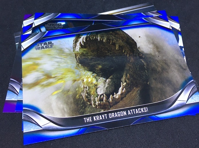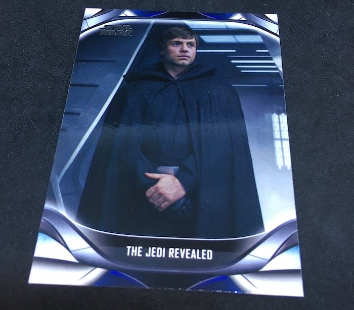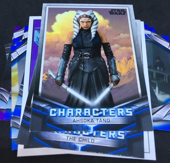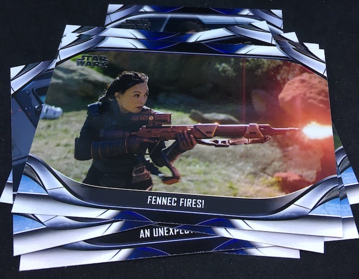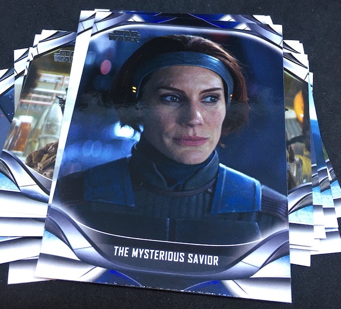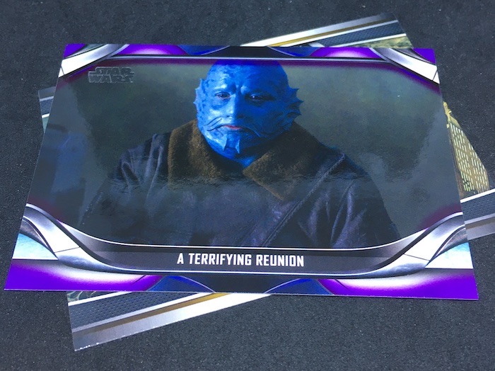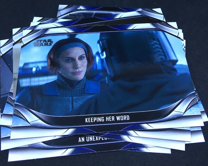 What's Buzz-worthy: The packaging here is among the best I've seen in recent years -- Baby Yoda (err, Grogu) in his pod is a tin holding a small but potentially potent stack of packs. (I have seen empty tins alone with asking prices of $19.99 on eBay, by the way, in case your box doesn't deliver big.) The format here is essentially like the Black & White sets of the past -- almost a mini hobby box -- so I'd be cautious about paying too much for one of these, but there's some potential in this one. There's only one auto per box and my box didn't even include any numbered parallels beyond an autographed parallel, which was one in 109 packs. (Will that one pay for the box? Actually, maybe based on prices for easier versions found so far.) The star power here is pretty good beyond Baby Yoda with what I think are the first in-pack Star Wars cards for Rosario Dawson, Mercedes Varnado (aka Sasha Banks), Katee Sackhoff and Timothy Olyphant though the autograph checklist doesn't include them. There is, however, ink from Pedro Pascal, Carl Weathers, Horatio Sanz, Temuera Morrison and Giancarlo Esposito and they have credits beyond Star Wars that should add in some extra appeal beyond their spots here. Among the deluxe hits are dual- and triple-auto cards Source fabric Relics, prop Relics and sketch cards, too. I've seen some cool sketches so far and there are some autographed medallion cards also in the mix so there is a lot to chase in these little boxes. I did notice a decent/odd amount of wear on the Characters inserts here that hurt the fun factor here as I got a couple of key names but all in all these small boxes are simple breaks that have good potential. Had they landed some of the newcomers on auto cards atop those already in here this one could have been truly massive ... perhaps some were held for the upcoming bounty hunters release or for more of a higher-end product? There's enough here to collect for now, though, and I might once more volume arrives on eBay. I'll perhaps rip into these some more if the prices settle down -- the one auto I was hoping to see here didn't happen so I'll probably just mostly do singles there.