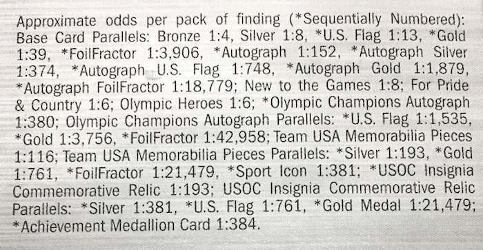 What's Buzz-worthy: This one was originally slated to arrive last year -- hence the year on the box to match the original event year -- but with the Olympics cancelled the cardboard waited ... and yet the bottom panel here carries a 2021 trademark as do the cards. The checklist is perhaps a little smaller than other past releases and the list does not include any women's gymnasts or men's basketball stars so a few things could have been in play here beyond it having been shelved and then revived. Rather than dwell upon what's not here I'll just ponder the idea of whether we'll see Olympians on Topps Now cards this year ... I have no inside info but it could make sense for some sports. We'll see. (I wouldn't expect basketball but other popular sports might be game.) This box's only duplicate was a pretty high-profile name (though she has a lot of cards vs. others here) and then she was among the parallels. Two very notable USA Softball stars also showed up in the box to help give it a little better feel for such a small box. I'd suggest doing a hobby box with some guaranteed hits and a lot more volume here. The checklist limits some of the break-out potential here but there are typically a few names who fare well in events and then have their autos or rarer cards blow up as people want their cards but may not know where to find them other than on eBay. You can find autos and other inclusions here but at pretty long odds considering there are only five packs per box (at least the blaster boxes are $10 SRP) -- autos start at one in 152 while Relics start at one in 116.