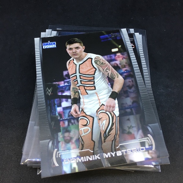 What's Buzz-worthy: This is a brand I have bought -- pre-ordered at times even -- since its arrival in 2015 and this was one I reluctantly grabbed since it was the finale as WWE moves to Panini America this year. Why reluctant? The design is a bit dark yet still crisp for the brand -- not the norm for this line -- but also because the boxes, while safe, have gotten steeper in price over the years. (Not by a lot but enough to slow me down.) You get eight autos and two Relics per box here and that's what helps make it a somewhat safe buy for the deluxe price. This box showed how there can still be hit-and-miss results but with the volume helping out. This is an A+ box thanks to one tough card of a solid name -- that Mysterio auto is one in 186 packs (19 boxes) -- the exact same odds of landing a Fistograph autographed fist-print box-topper card. (I'd take the topper -- Sasha Banks please -- but I'm OK with this one.) The Booker T auto from that set is one in 24 (three boxes) and that is the same odds as the basic Relic here (though they have to flow well with the parallels) and the Green is one in 48 -- with a memorable match getting the nod on both pairings. Beyond Mysterio, Flair (if I get it), and maybe Nakamura, this box's autos were average at best. The auto lineup checklist is fine but perhaps on the lean side for variety's sake (skewing older and toward the men's side ... this box shows it) and that may be since it was originally slated to arrive early last year. The base set also feels on the lean side with it perhaps once having a lot of names that were cut in the last year -- I only got two former names in my base here and that number of cards (74?) seems odd to me. Once again, the color parallels are the highlights in my mind for this one and the Hartwell RC parallel was likely my best there though that Blue is one in three boxes. The Grand Slam inserts help add some variety here as well, which is something some years of this one needed. All in all, though, these are about the ink and some color ... I had a hint of it but I want more. There are only two final Topps WWE sets to come ... so we'll see how this one compares. It has its moments and it's a contender for the best one of the 2020 lineup that we have seen all drop in recent weeks though other sets will have more younger stars' sigs.