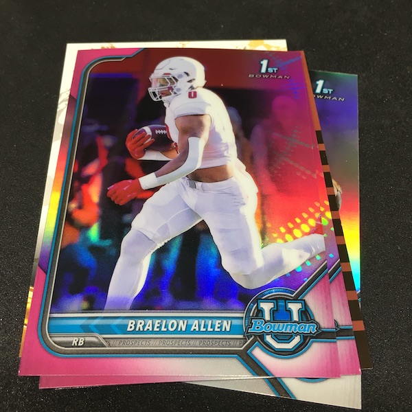 Pink Chrome Prospect (Refractor finish) parallels (4) – Jaylen Watson, Braelon Allen, Tyler Badie, Devin Lloyd