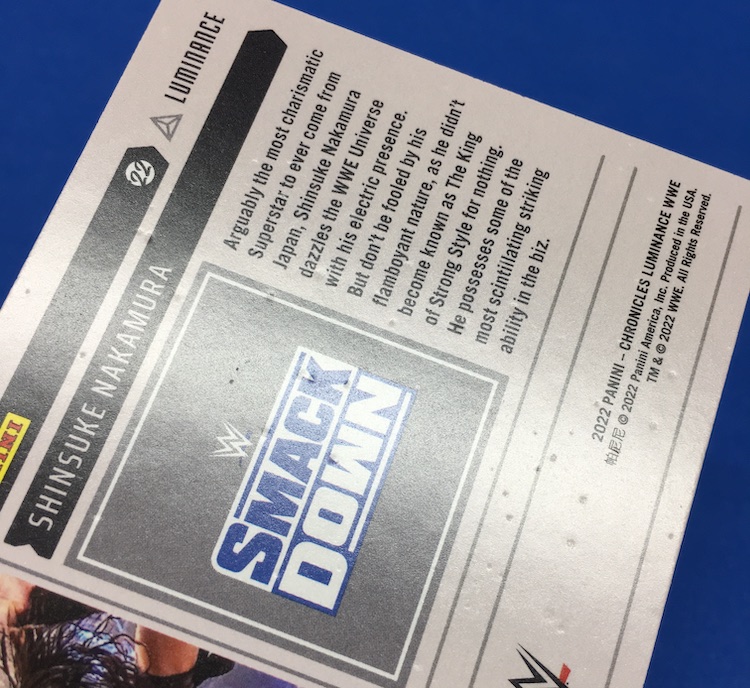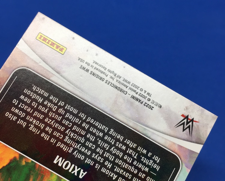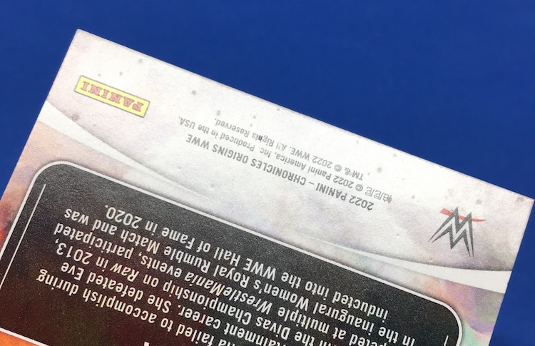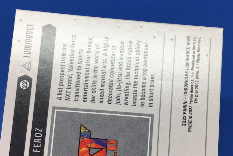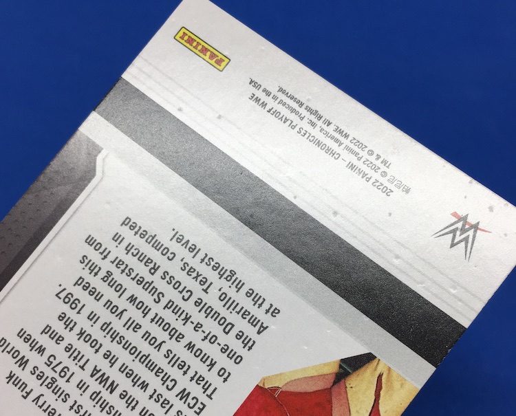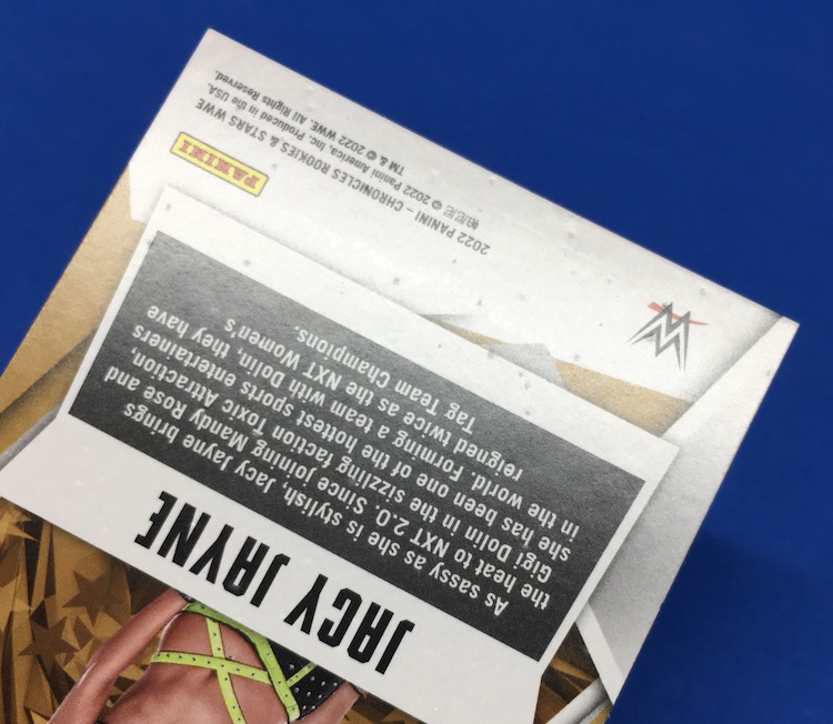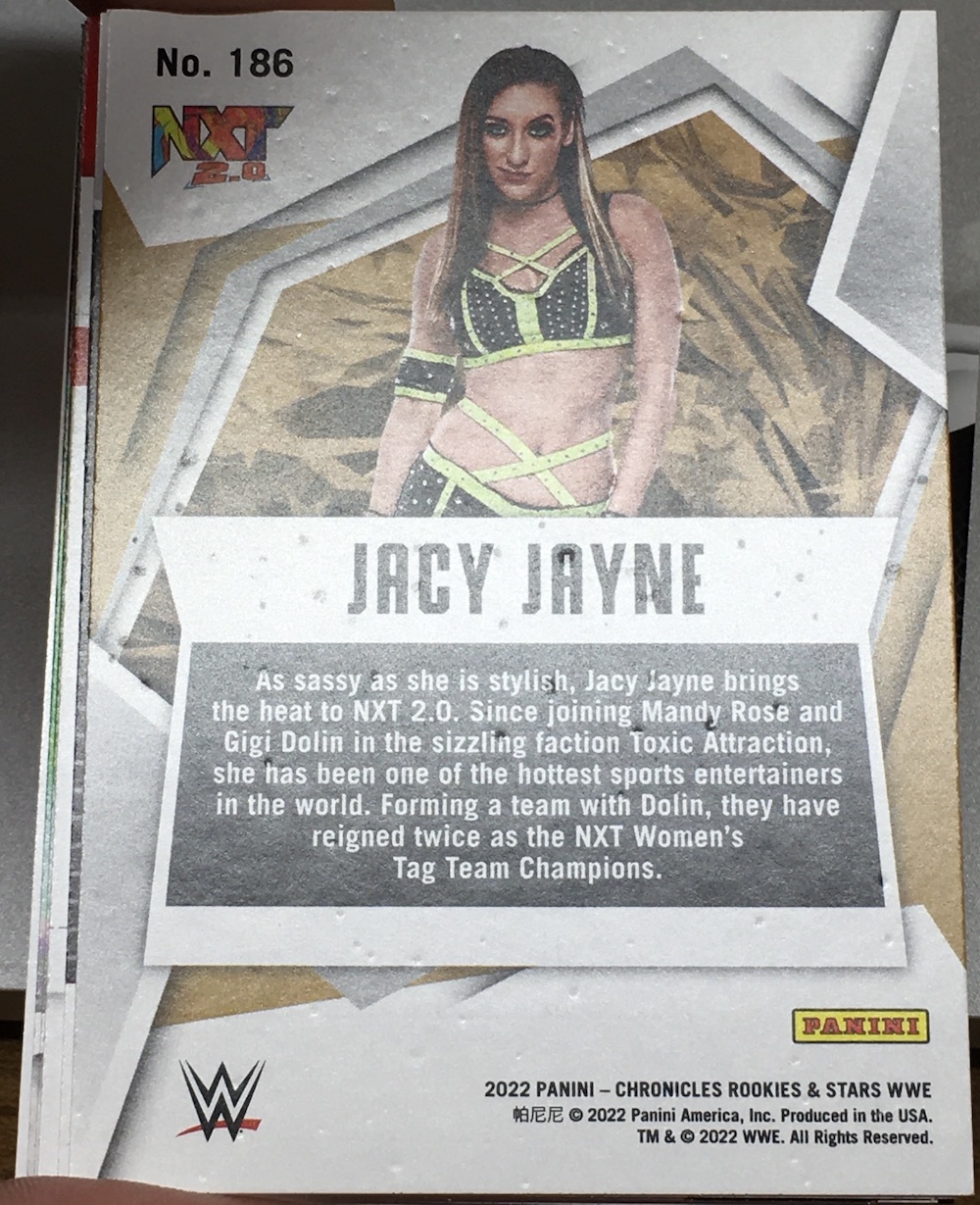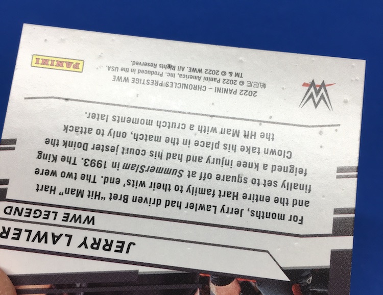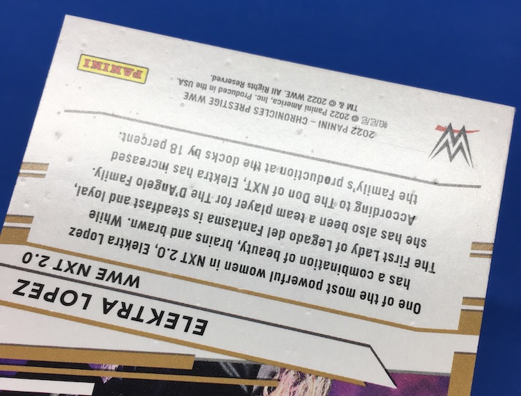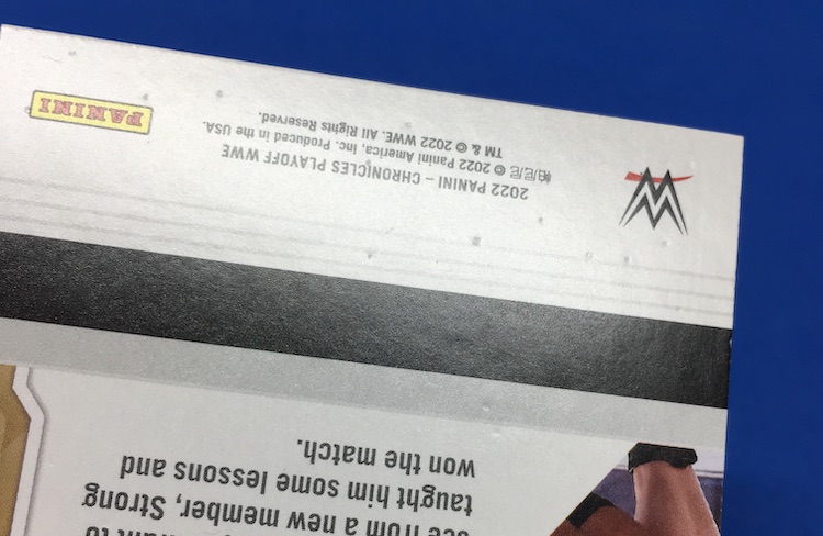 What's Buzz-worthy: I've busted tons of Chronicles boxes in all sports over the last few years -- maybe more than any one brand, really -- but this one was a Smackdown for me in a couple of ways since its arrival late last year in hobby and then this month when blaster boxes finally hit retail. With my plans for BuzzMania 6 under way -- a day of WWE breaks on March 31, the day before WrestleMania -- that I've begun work on, I picked up a trio of these after getting smacked around on a multi-star Chronicles hobby case break rather severely. Awful collation got me bad. (I got eight basic cards from a number of possible names in a full case ... and zero Liv Morgan cards despite her checklist presence pushing 40 cards.) This format? Well, it gave me four cards I would have landed in that case break right off the bat -- so the collation can't be as "off" here -- but then I flipped over the cards to see the backs. The errant gloss that plagued the NXT release is back here (only a big deal there if you grade but definitely annoying) but more than a dozen cards here looked like they were stored on gravel before pack-out with dents across the board just like this at right ... some so rough there were hints of these issues showing on the card fronts. I found a few more in each of my other blasters but not as many as this box (at least with a quick scan) but ... still a very bad second impression atop the bad first impression. Good ol' Ezekiel took a punch to the face and you can see all of 'em in the gallery -- though the photos aren't as obvious to show the wide damage line the Jayne card above. ... The array of possible finds in this release should make it an easy A+ in my book -- it's a catch-all loaded with stars and a number of NXT newcomers who had zero cards before this release or are RCs in anything from 2022 -- but, well, I'm quite glad I didn't order a case of either format here. (I pondered both.) The autos can be hit and miss, too, with some older names and a lot of new names in play -- but also some huge names possible as well. Ideally, this is just a small-batch problem ... maybe I just got bad boxes ... but if it's not? I'm going to be torn about this one. Will I do more? I want to ... but I know I shouldn't. Will prices drop? Maybe, maybe not. (I'll rip if they do.) The hobby boxes have a lot more going on, including two autos per box every time and then a number of chases that are in the case level. This one? It doesn't feel as lean as Prizm but if you strip away the variety of the subsets/brands within the release then it's somewhat limited with just Bronze and Green parallels across the board and then seven sets of Red parallel autos. How easily does ink flow? I'm not sure but I went hitless in three boxes (probably expected) but ... all the damage did a number on my interest here. Damage CTRL certainly didn't get a look at this box. I'll offer more thoughts on this one in coming breaks or during BuzzMania 6 ... March 31 be there.