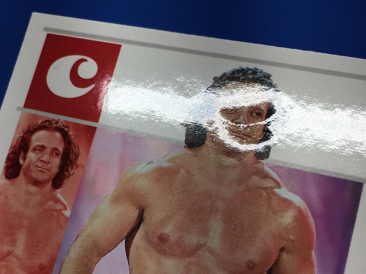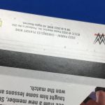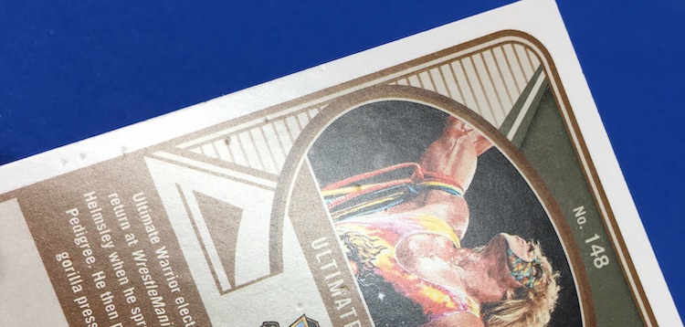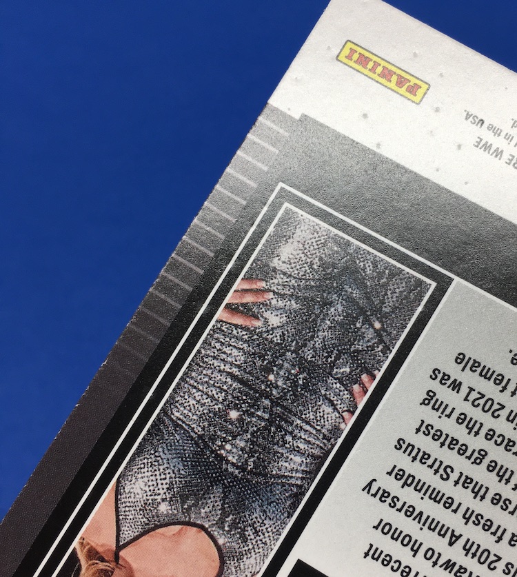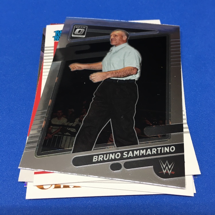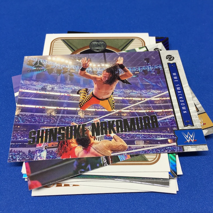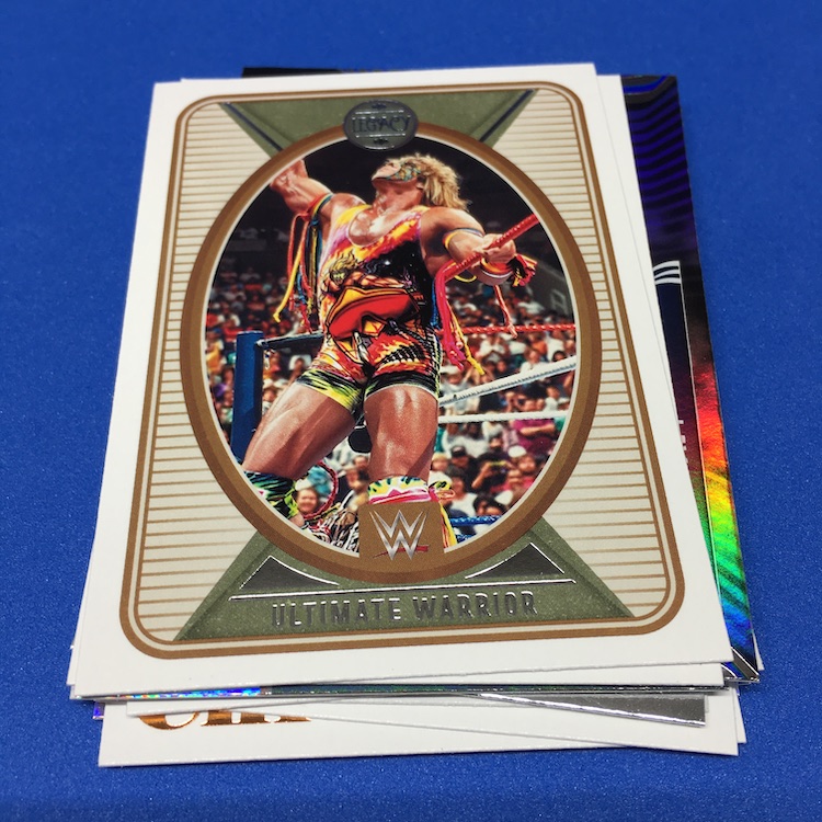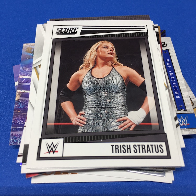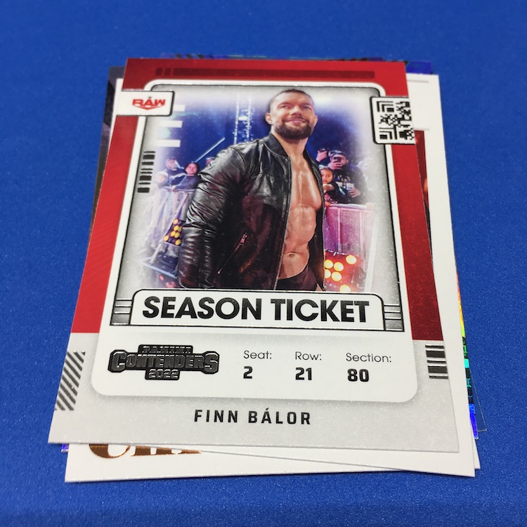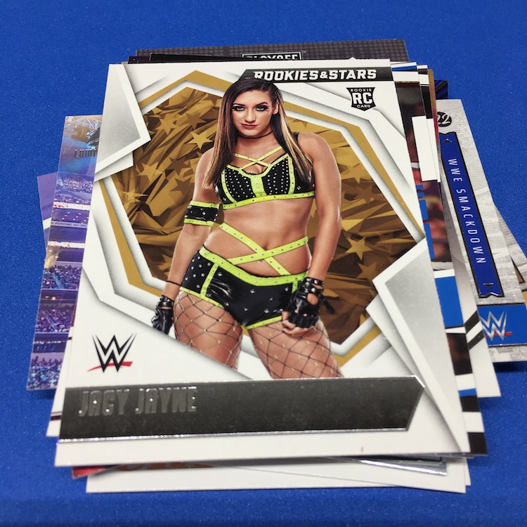 What's Buzz-worthy: I've busted tons of Chronicles boxes in all sports over the last few years -- maybe more than any one brand, really -- but this one was a Smackdown for me in a couple of ways since its arrival late last year in hobby and then this month when blaster boxes finally hit retail. With my plans for BuzzMania 6 under way -- a day of WWE breaks on March 31, the day before WrestleMania -- that I've begun work on, I picked up a trio of these after getting smacked around on a multi-star Chronicles hobby case break rather severely. Awful collation got me bad. (I got eight basic cards from a number of possible names in a full case ... and zero Liv Morgan cards despite her checklist presence pushing 40 cards.) This format? Well, it gave me four cards I would have landed in that case break right off the bat -- so the collation can't be as "off" here -- but then I flipped over the cards to see the backs. The errant gloss that plagued the NXT release is back here (only a big deal there if you grade but definitely annoying) but more than a dozen cards here looked like they were stored on gravel before pack-out with dents across the board just like this at right ... some so rough there were hints of these issues showing on the card fronts. I found a few more in each of my other blasters but not as many as this box (at least with a quick scan) but ... still a very bad second impression atop the bad first impression. Good ol' Ezekiel took a punch to the face and you can see all of 'em in the gallery -- though the photos aren't as obvious to show the wide damage line the Jayne card above. ... The array of possible finds in this release should make it an easy A+ in my book -- it's a catch-all loaded with stars and a number of NXT newcomers who had zero cards before this release or are RCs in anything from 2022 -- but, well, I'm quite glad I didn't order a case of either format here. (I pondered both.) The autos can be hit and miss, too, with some older names and a lot of new names in play -- but also some huge names possible as well. Ideally, this is just a small-batch problem ... maybe I just got bad boxes ... but if it's not? I'm going to be torn about this one. Will I do more? I want to ... but I know I shouldn't. Will prices drop? Maybe, maybe not. (I'll rip if they do.) The hobby boxes have a lot more going on, including two autos per box every time and then a number of chases that are in the case level. This one? It doesn't feel as lean as Prizm but if you strip away the variety of the subsets/brands within the release then it's somewhat limited with just Bronze and Green parallels across the board and then seven sets of Red parallel autos. How easily does ink flow? I'm not sure but I went hitless in three boxes (probably expected) but ... all the damage did a number on my interest here. Damage CTRL certainly didn't get a look at this box. I'll offer more thoughts on this one in coming breaks or during BuzzMania 6 ... March 31 be there.