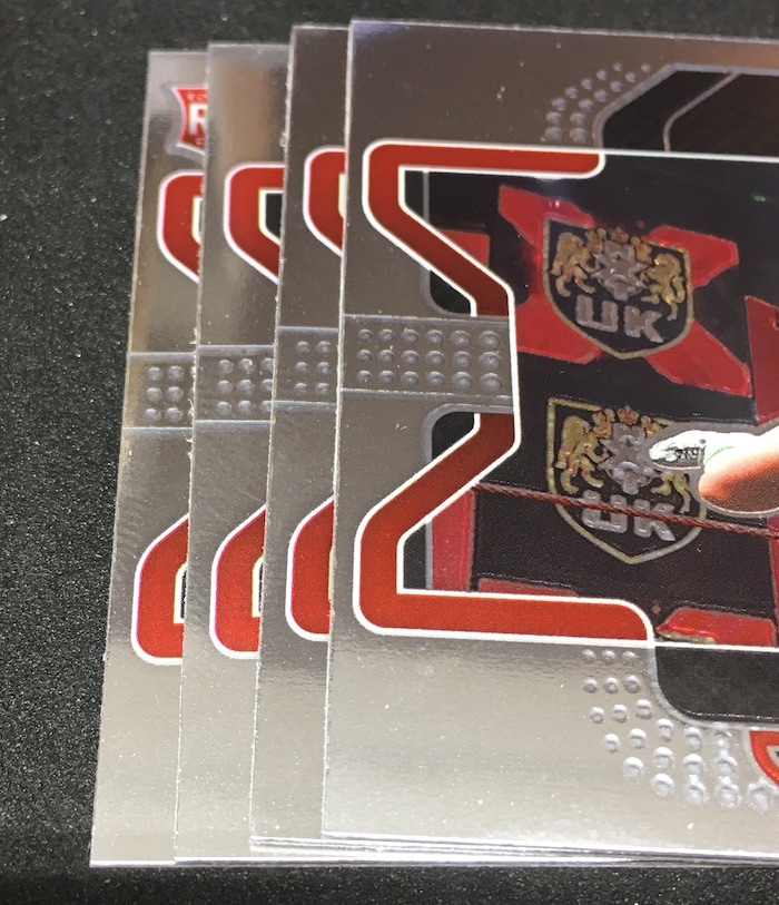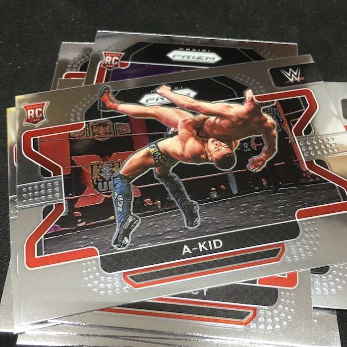 What's Buzz-worthy: My second pack here? Better than the first in a couple spots -- but damage (at right) on the best card, oddly bad centering on half of the base, a washed out Red side on a Red White & Blue parallel and the retail sticker price ($15.98) all added up to a rough go in the ring with this one. ... Like the blasters, it's not that flashy of a per-pack mix to start with. This format adds the Red White & Blue parallels to help it a lot but I don't think it's enough at the price as base cards are still super-plentiful and cheap as singles more times than not. Silvers and Greens are also a highlight here if you get one -- they're not guaranteed -- on a key name though the big set makes that harder. (Silver this time was a good name but perhaps not a money name.) ... This one is a landmark release in that it's the debut of Rookie Cards for almost all of the NXT 2.0 stars (a small number snuck into a couple sets last year) and a number of NXT UK performers who didn't have cards, either, beyond it being a Panini first. Becuase of this, the RC volume is abnormally high as they are all in the base set. Previous releases used "First NXT card" labels and then RC logos once stars arrived on Raw or Smackdown or had those NXT debuts in insert sets. ... These carry a higher suggested retail price at retail than Prizm stuff of a few years ago (like all Prizm/Optic now) so that eats into things, too, if you're looking to flip and don't land something more notable.