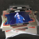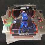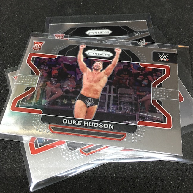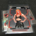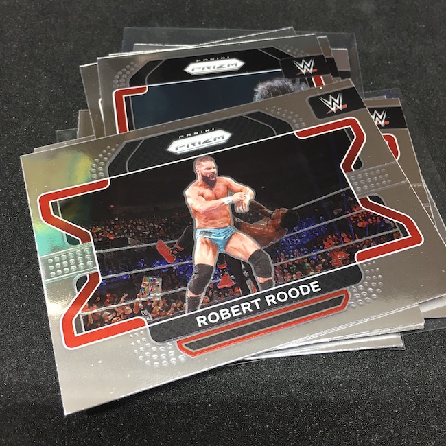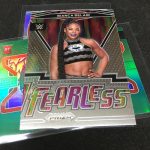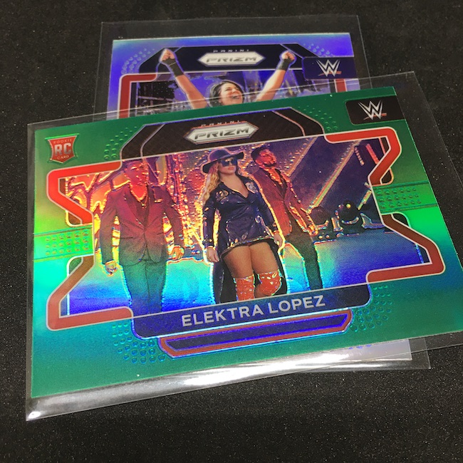 What's Buzz-worthy: My second box of this was the norm in terms of what's found -- no extra Green this time -- and it was overall pretty good, though not as flashy as one might expect. This format? It's just not that dynamic -- it's a basic mix with Silvers and Greens. ... This one is a landmark release in that it's the debut of Rookie Cards for almost all of the NXT 2.0 stars (a small number snuck into a couple sets last year) and a number of NXT UK performers who didn't have cards, either. Becuase of this the RC volume is abnormally high as they are all in the base set. Previous releases used "First NXT card" labels and then RC logos once stars arrived on Raw or Smackdown or had those NXT debuts in insert sets. This first Panini WWE release does seem to have a lot of issues with left-right centering and then I have also seen what feels like a large number of rough plastic cuts or other issues (see above right) -- but that's just me and since I like to grade stuff. (Maybe it's you, too, I don't know.) These carry a higher suggested retail price at retail than Prizm stuff of a few years ago (like all Prizm/Optic now) so that eats into things, too, if you're looking to flip and don't land something more notable. This one has a deep 200-card checklist that's loaded with past, present and future stars. Other formats are definitely stronger but they will cost you more the demand (hype) that comes with heavy Prizm buyers.