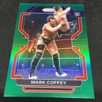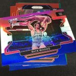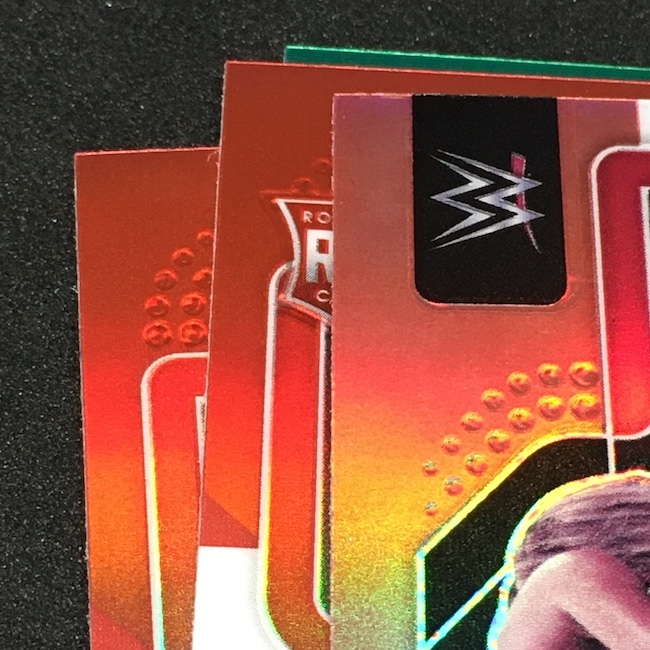 What's Buzz-worthy: I hadn't run into any of these out in the retail wild until this weekend and was presented with a tray -- so I grabbed two packs not knowing the cost -- but at their premium price ($15.98) and after opening, well, I should have passed. Why? Like the blasters, it's not that flashy of a per-pack mix to start with and half of the base cards here were dramatically miscut while one of the Red White & Blue parallels was running light on ink -- and that happened twice. Atop this, there were no basic RCs in this pack and more lesser names were found than notables across the board. A Green Prizm isn't the norm -- that made this one's insert total the same as a blaster -- but there's just not much here. At the higher price (albeit for perhaps a bigger pack than some Optic/Prizm packs) there was more sting to it ... but at least the rough cuts that I have seen seem to be cleaner. (Are these from a newer printed wave?) The centering was an issue in blasters, too, and it seems to be a challenge on a lot of everything here (good luck grading ... but it's do-able in some instances.) Are they 100-0 bad centering? No, but certainly off enough that there is not good eye appeal for a big chunk. This format adds the Red White & Blue parallels to help it a lot but I don't think it's enough at the price as base cards are still super-plentiful and cheap as singles more times than not. Greens are also a highlight here if you get one -- they're not guaranteed. ... This is a landmark release in that it's the debut of Rookie Cards for almost all of the NXT 2.0 stars (a small number snuck into a couple sets last year) and a number of NXT UK performers who didn't have cards, either, beyond it being a Panini first. Becuase of this, the RC volume is abnormally high as they are all in the base set. Previous releases used "First NXT card" labels and then RC logos once stars arrived on Raw or Smackdown or had those NXT debuts in insert sets. ... These carry a higher suggested retail price at retail than Prizm stuff of a few years ago (like all Prizm/Optic now) so that eats into things, too, if you're looking to flip and don't land something more notable. (That happened here.) This set has a deep 200-card checklist that's loaded with past, present and future stars so that can mean hot boxes or lean ones.