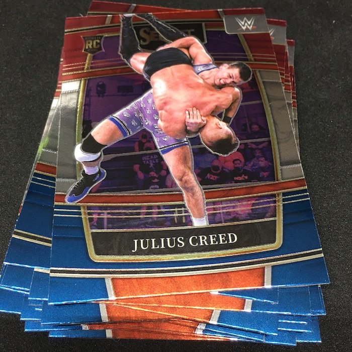 Red & Blue Concourse (base parallels) (16) – The Rock, Brock Lesnar, Jerry Lawler, Jimmy Uso, Ted DiBiase, Rikishi, Dominik Mysterio, Omos, Diamond Dallas Page, Big E, Mansoor, Kushida, Grayson Waller (RC), Julius Creed (RC), Farooq, Michael Cole