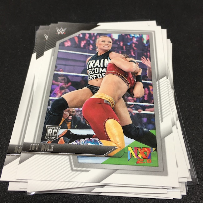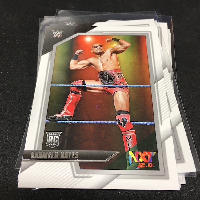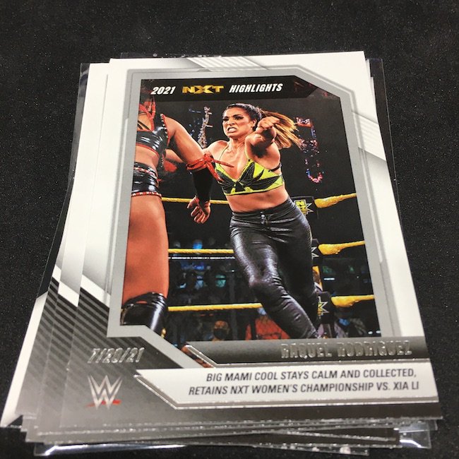 What's Buzz-worthy: Two thoughts ... had NXT stars not appeared on the checklists of the first three Panini America releases, this one would be a monster -- and yet at the same time there's a lot to like here even though there's no razzle-dazzle Revolution stock or Optichrome to be found here. What is here? A meaty dose of Rookie Cards -- 60 on the checklist (61 if you include UK star Johnny Saint on his first WWE cards) -- and a photography showcase with on-card autos and plenty of parallels for a budget price. I landed a rare auto-mem card of a notable young guy here so no on-card ink for me (the on-card autos might be the best-design cards and best photos of the bunch) but I think I still got a healthy dose of what this one is about. I was a mere Kevin Owens base card short of the set and I got a parallel of a key young name, too, to help things out here with a lot of extra RCs to add to grading potential for those I like. (Unfortunately, the stock type can have its issues to watch for but it's generally cleaner than I expected.) The parallels aren't as perhaps as plentiful or colorful as I had hoped for -- some parallels are quite colorful of you find them -- but this one is loaded with past and present talent for WWE's developmental program. This one is loaded with stars who haven't had cards before -- or had no cards at all before Panini America took over the license this year -- and that's partly due to the influx of new names for NXT 2.0 (now back to just NXT), NXT UK and getting caught up on production cycles post-COVID. (Topps' NXT releases had a lot of delays so checklists didn't have as many new names.) All in all, I liked this one more than I had expected so I will rip more -- and there should be a retail element here based on box side panels noting hobby-exclusive parallels here -- though I'll probably rip hobby with the guaranteed ink until we know more on that front. (NXT only went retail once under Topps.) This one has a lot to chew on and it's really Panini's first traditional-stock release of the year ... perhaps it could set the stage for some traditional, affordable releases for collectors not into solely chrome stuff to rip? We'll see. I'll offer more thoughts here when I do more.