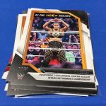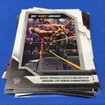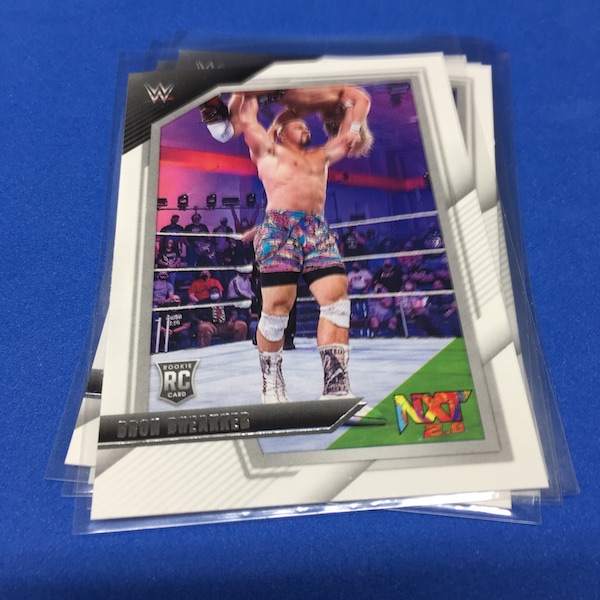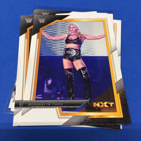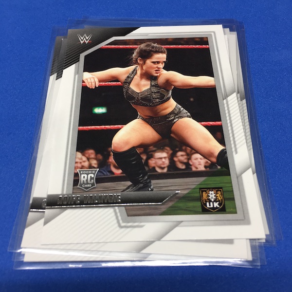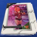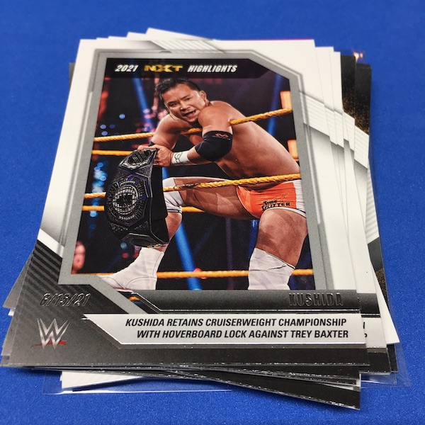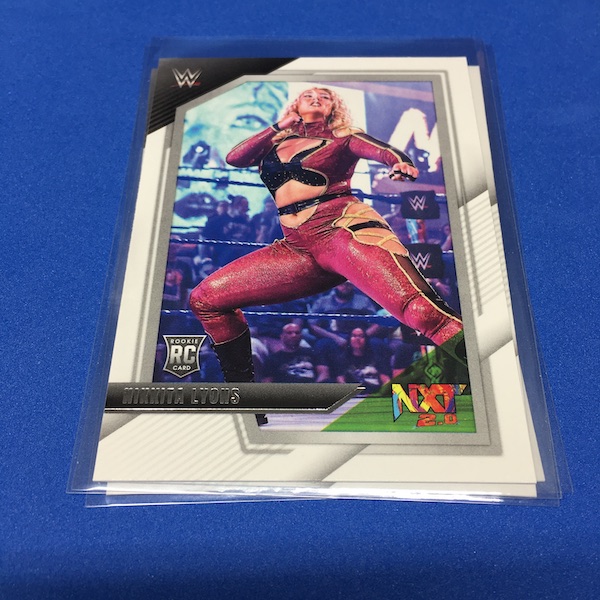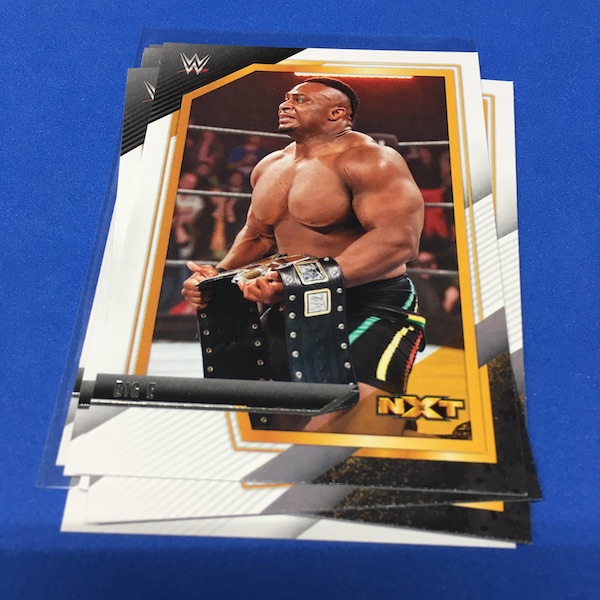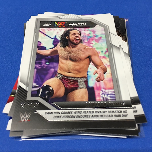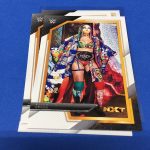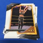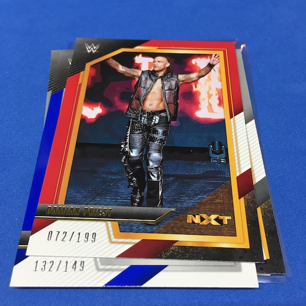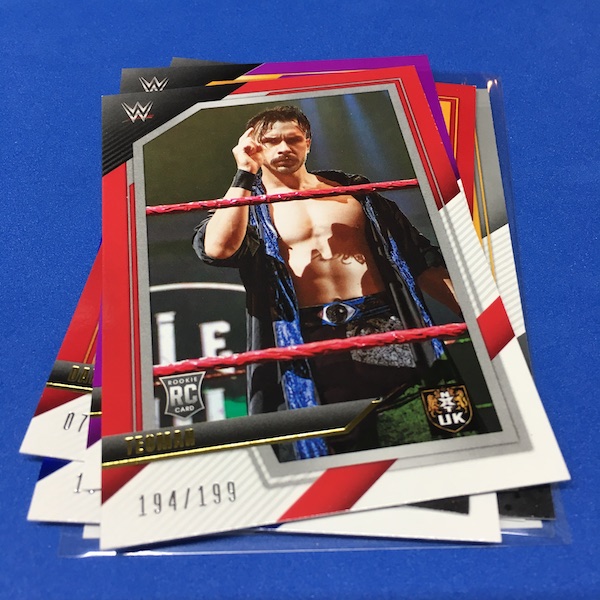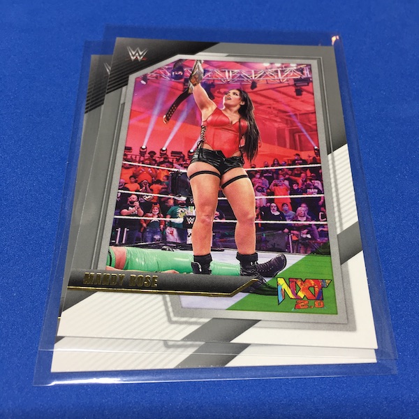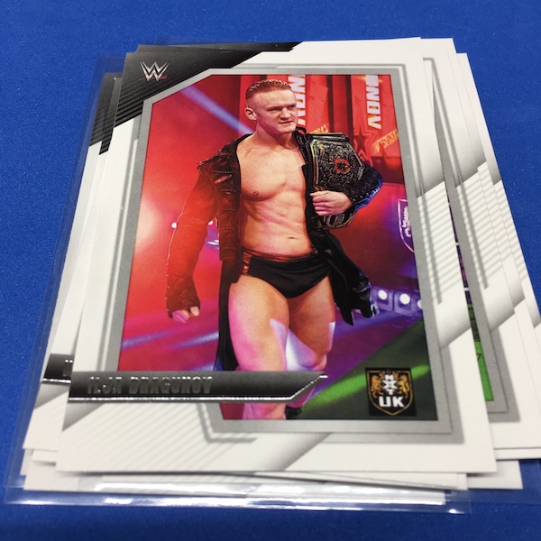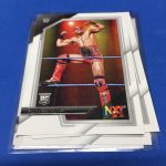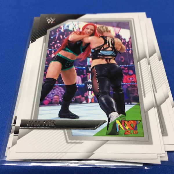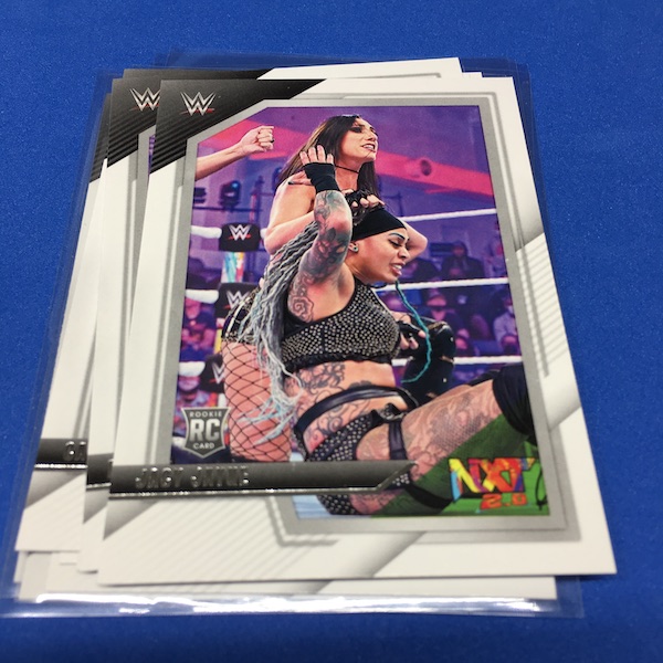 What's Buzz-worthy: My third hobby box here is probably a lot closer to the norm as I found Gold hits of different kinds (/10) in my first two. This time? An auto for a notable but affordable newcomer and a pretty standard mix of everything else ... so still pretty good just not one bigger card to get it to the bigger stage. ... Two thoughts ... had NXT stars not appeared on the checklists of the first three Panini America releases, this one would be a monster -- and yet at the same time there's a lot to like here even though there's no razzle-dazzle Revolution stock or Optichrome to be found here. What is here? A meaty dose of Rookie Cards -- 60 on the checklist (61 if you include UK star Johnny Saint on his first WWE cards) -- and a photography showcase with on-card autos and plenty of parallels for a budget price. The only drawback? Some of the quality control concerns of cardboard stock -- edges and surface issues on some cards repeatedly across all my boxes -- and then errant gloss on the backs of pretty much everything all the time. If you're just collecting then these aren't that big of deals but if you like to grade newcomers' first-year cards it's something to watch for ... I don't think there will be any rock-solid 10s arriving here en masse on pop reports. ... The parallels aren't as perhaps as plentiful or colorful as I had hoped for -- some parallels are quite colorful of you find them -- but this one is loaded with past and present talent for WWE's developmental program. This one is loaded with stars who haven't had cards before -- or had no cards at all before Panini America took over the license this year -- and that's partly due to the influx of new names for NXT 2.0 (now back to just NXT), NXT UK and getting caught up on production cycles post-COVID. ... This one has a lot to chew on and it's really Panini's first traditional-stock release of the year ... perhaps it could set the stage for some traditional, affordable releases for collectors not into solely chrome stuff to rip? We'll see.