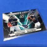 What's Buzz-worthy: I found this one buried in the back of a stack of baseball blasters on the bottom shelf in the retail wild -- the only one -- and decided to bite since it's got a guaranteed hit to justify its slightly higher price ... and between that and a couple of inserts here I didn't do too shabby. The base set is oddly simple and a definite throwback -- kind of like Capstone baseball but with a little more color and more of a feel that fits right in in the Pacific/Score/Pinnacle realm of past NFL cards. The foil-etched inserts here are nice -- and Brady there is even nicer -- and the Tua hit worked for me though it's not noted as game-used. The basic stuff here is not holofoil like the hobby basics -- the opposite of Capstone -- and you get a lot more here vs. hobby boxes that are two hits, two holofoil base and then two inserts. (That's it.) This one can include autos and other inclusions and an array of stuff and that might make these deliver a little better than one might think and there's a decent shot some could out-deliver a hobby box given market prices on that side. The rarer Aloha cards are also found here, too. All in all, this one surprised me more than I had expected and it might prompt me to try more if I spot it again in the wild.
