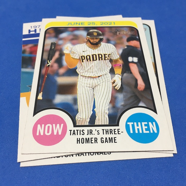 What's Buzz-worthy: I guess this dud of a box -- not an average one though with it having a Chrome -- balances out the mispacked one I got last time that worked out in my favor. (Good or bad happens both ways). That awfully centered Chrome is one in 54 packs and that stat is about the only thing that saved this one from being a C-grade box. It was rough without key rookies, one fewer SP than normal and, really, not a lot of oomph otherwise other than a pair of cheaper Padres card and two Hall of Famers. ... As I've said before, this one is a fun rip for 1970s Heritage -- can't say that every year -- and HHN is one that has such a loaded set that it's perhaps harder to get a truly bad box on the RC front. ... If I liked the 1973 design more, this brand might have landed an A+ grade overall as this is the kind of release we need to see more of -- a lot to chase -- but without a price that forces one to rip and flip since it's so expensive. It's a better experience with hobby boxes for their price and that sale price is good right now -- and there's a guaranteed hit and more along with a near-set in every box. I say rip those until they rise or dry up and then snack on these blasters or the megas later as long as they are reasonably priced.