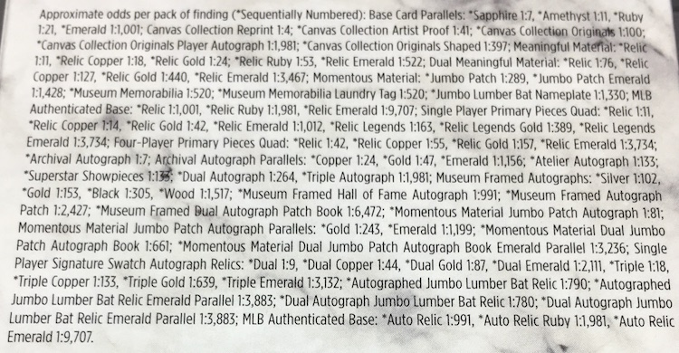 What's Buzz-worthy: This one is right there in the Museum Collection wheelhouse -- if you land bigs, you'll know it but if you don't then this one might not appeal to you that much. The Mauer card here is one in 81 packs -- that's 21 boxes -- while the J-Rod isn't a tough pull but do the math there and it's roughly one in 34 boxes to pull a Copper of any one player. The other hits here aren't bad finds for star power, strong teams, low volume or young players but those still might not be what people are looking for here. These boxes can be hit and miss but you get your shot at the big stuff in every pack with particular types of cards all assured in a box. Your best bet is to do by the box to guarantee ink -- the Relic packs can be misses for the price -- and that's certainly not a new development for this brand. I graded this one higher than last year by a hair as I like the design here more -- it's got a high-gloss stock on the fronts but it's a bit soft so you will probably find issues on the card backs. I ran into that here a couple times ... unfortunately on the bigger cards. ... I have always liked the feel of this one but it is one that I have had more fun with just picking off what I like via singles or by doing group breaks -- but boxes like this do show there's big potential -- and this is a top box that can be topped with some luck.
