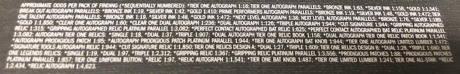 What's Buzz-worthy: Releases like this one have been interesting ones from a breaks perspective if you ask me -- that's how I first dabbled here long ago -- as the overall mix in a box can be lean at times. Two of the cards here show how these can be a challenge with cards higher-numbered not always carrying the value oomph one might expect in a premium-feeling brand. Both of those are the basic version so there won't be a lot of chasing happening there ... but the Henderson? That's one in 60 packs and it helps a lot that it's a Hall of Famer who hasn't always been a heavy signer. (He's findable but hasn't ever really been super-cheap.) It's an acetate layered card where the ink appears to be on the front side of the back panel -- so the ink is inside and it can't be touched ... and the light dust can't be removed that's in there, either. (You can't really see that in my pic as I laid it on white cardboard.) Atop that, the acetate is scuffed some while also having a light texture within the layered design, too. It's an interesting approach that I'd like a lot if it didn't look a little dirty. (Grading is a no here.) But all that said I'd rather find that one in a box than not. ... Just like I said last year, I may be crazy, but perhaps this one could be bolstered by having a small non-Relic base set and a RC and veteran in every box, too? Check out the checklist above and the odds below -- there's some big stuff to be found here and that's why it makes for a good rip if it's a release that fits your budget and your tastes.