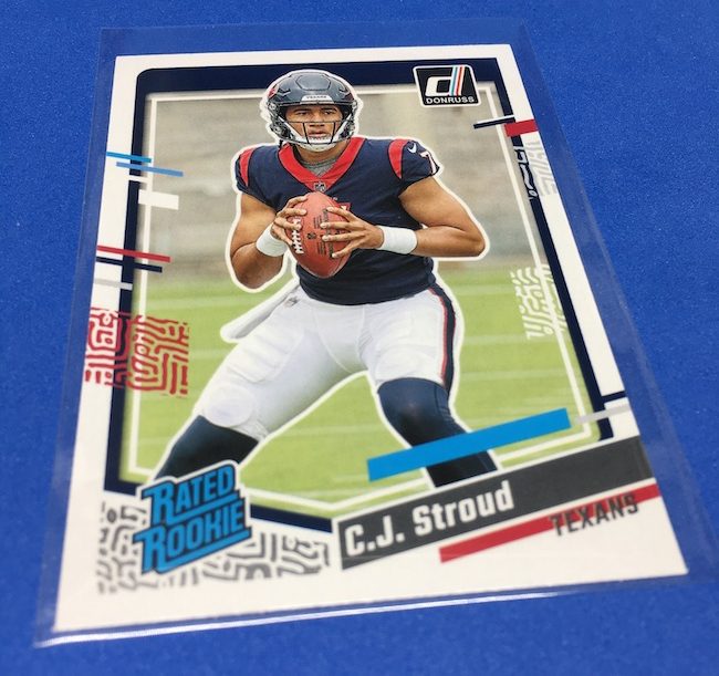 What’s Buzz-worthy: This annual edition of Donruss -- a retail-chain exclusive -- is one that includes a pair of card types both found one per box in this format and they're both ones that make this one worth the look. This time? Not sure either one -- the Optic card or the hit -- were winners but landing a Rated Rookie for C.J. Stroud makes this one an A-caliber box. Now, had a top name like him landed in those two premium spots? Big-time win ... and that's why this format (hit that link up top) is a winner in my book. The photos here have stronger, tighter crops than I remember from a lot of Donruss releases while this framing is new with some slightly retro touches that are a little heavy but not too obnoxious. The patch of silver foil on the cards I could live without but they do add some extra "feel" here beyond basic cardboard. My run of base was pretty lean on top, notable offensive stars (names and gallery show how much I had to dig for names) and the rookies were fine with Stroud ... without him this one would have been trouble as the overall insert presence here feels small for a Donruss NFL box. The hit and the Optic card are big keys here for sure and they're both reasons why I'd choose this one over the basic version, myself. I'll offer up more on this one if I rip more -- there's a good chance I might.