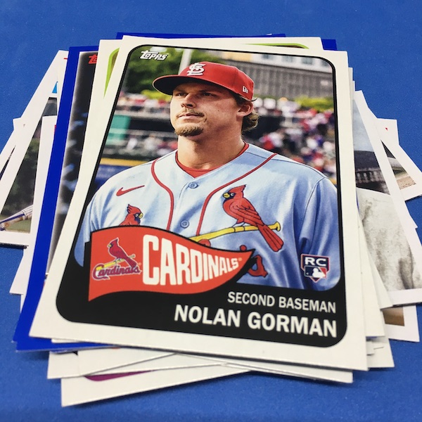 What's Buzz-worthy: Buzz should be happy with a blaster that yielded Carroll, Henderson, Volpe and Rutschman among the rookies alone along with a parallel that's one in 70-some packs, but this one once again fell flat -- way flat -- with damaged cards from what I'd think would be the packaging process along with maybe a dropped-box scenario, though not all cards suffered that fate so maybe not. All of the 2003-styled (blue) cards had mangled corners as well as roller dents on the opposite side, while the 1965s had corners on both sides that feel slightly lifted/warped and the rest had smaller doses of that same touch. It wasn't good and it certainly overwhelmed what I landed in the box. Atop that, a number of the inserts had scratches on foilboard or errant spots in the stock used ... throwback finds for sure but ultimately not good. It was rougher than my first-impression box. ... As I noted last time, Topps tricked this one up for its hobby channels with the standard box having some exclusives, adding a smaller box still having a guaranteed auto and arriving in a lunch box (a good move for the ballpark price point) and then, well, the blasters felt lean to me. It might be the format talking, but this one just felt flat with three cards per year (1956, 1965 and 2003) per pack unless an insert flipped that around. The Silvers here are a blaster-exclusive and I'd really wonder how these boxes would feel without them. (With them, there's just not much going on here at all ... and, well, foilboard ain't doing much for me as it is.) ... This one is a collector release -- those two autos per hobby box aren't likely to get you ahead value-wise with most boxes but the collective total should have some potential here and there with a selection of good names past and present found here. It's fun but condition issues two blasters in a row pretty much make them worthless to me ... again. Maybe it will be cleaner if I were I dabble with a lunch box but my expectations are dampered there and I probably won't though I had intended to. There are perhaps more chase elements to liven this release up this year and the set's build is a bit simplified but fundamentals like basic print quality also matter. After two rough blasters I can say they matter a lot.