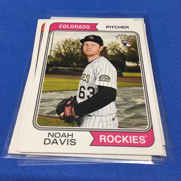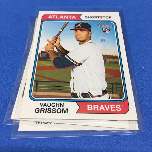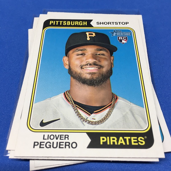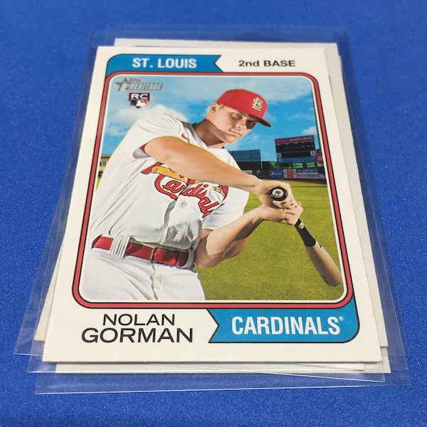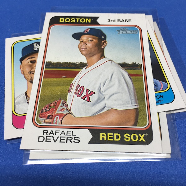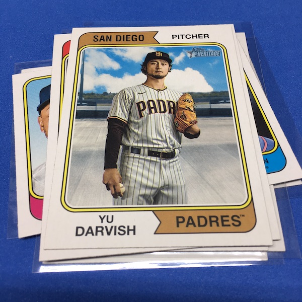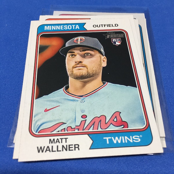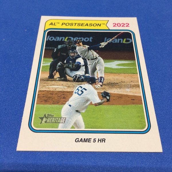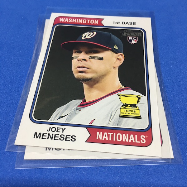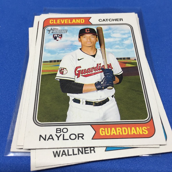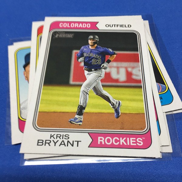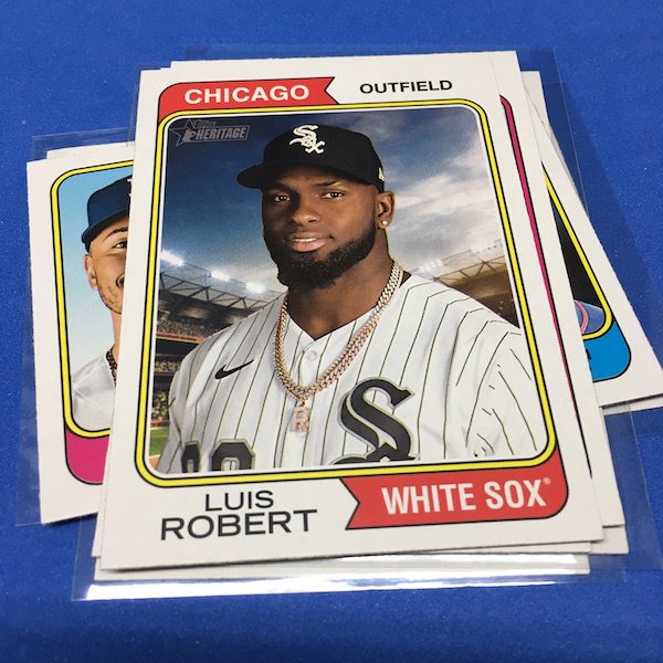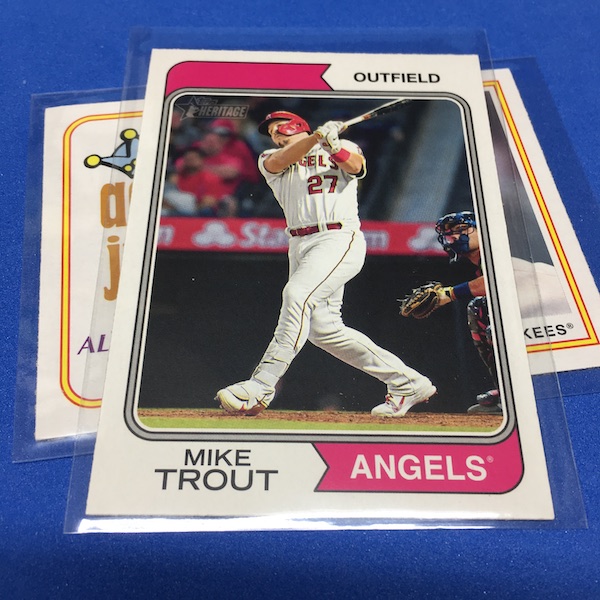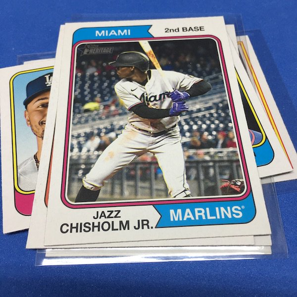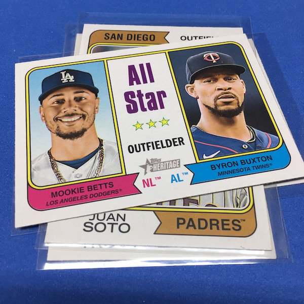 What's Buzz-worthy: The annual trip back in time via Heritage takes us back to 1974 this year and, well, I waited a little bit to grab this on as, well, the 1970s -- particular the stretch from 1974-79 except for 1975 is not among my favorites. (And, truth be told, 1971-73 weren't either ... but some of them had their moments.) This time, things are crisp and clean -- especially vs. the card backs and cutting of last year -- but the unfortunate death of Hank Aaron in January 2021 really deprived us of things that could have been found here to make this one a bonafide home run (pun intended) with his autograph presence and more mixed in as nods to his history-making that was first teased in the 1974 set and then revisited again in 1975. This blaster gave me this one's nod to all of that -- the No. 1 card is of Aaron Judge with a new twist on the Hank Aaron card from back in the day (see it here). All the quirks of Heritage are here -- and they're noted on the checklist so start there -- with the notations for most variations on the bottom of the cards near the Topps logo instead of around the card numbers. Buzz has been "in" on Heritage since its start with 1952 back in 2001 but I really could use a fast-forward to 1980. The Judge card, to me, is one of the best cards here ... but I can't help but dwell on the Hank Aaron touches that should have been found in this set. The quirks are good and this one is better than last year for sure but I'm just not that into 1974 at all with its quirks being more sloppy than interesting ... and the Angels names here ... that doesn't work for me at all. The photography is getting better as it started to back then -- still with some real trainwreck photos back in the day -- but there are nods here, too. Find Harmon Killebrew's 1974 card, for example, and compare that to No. 54 in this set (likely not an accident but I would have made that card No. 400). Those are the other kinds of touches that are fun here. There are a number of key names among the newcomers -- Michael Harris for example -- that I might chase but in some cases there are a lot of variations in play where the cards are visually just not that fun for me to pay up for so I'll wait to see if they soften. Hit hobby boxes for a guaranteed hit in every box -- and there are a few autos in every case -- and that's how I'll eventually go this year. Right now, I am just going to dabble here and there if any singles strike me. (There are some things you'll see in a Buzz Buys at some point.) I'll also do a hobby box here soon for a fuller and better bite at this one but I suspect there will be plenty up for grabs there and a healthy retail presence this year.