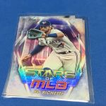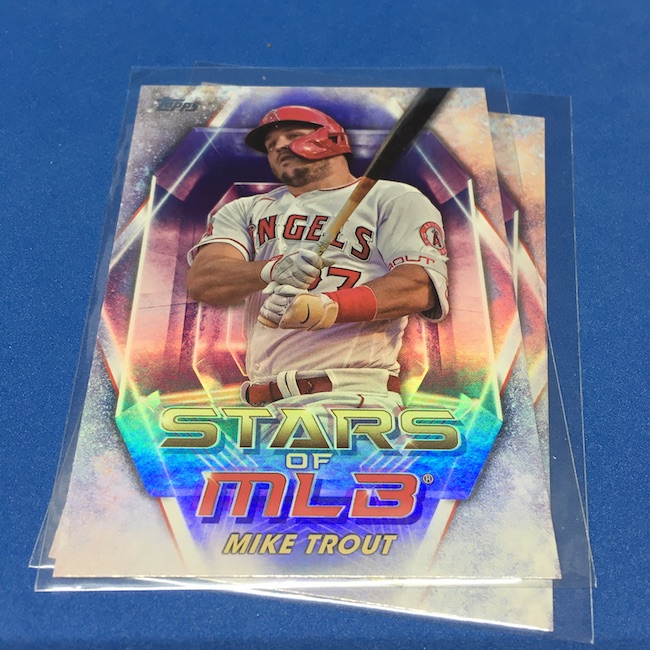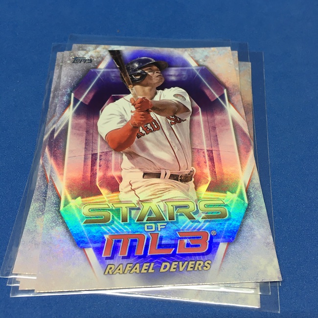 What's Buzz-worthy: I didn't intend to buy any more of this one but this one was a straggler on the retail shelf and it gave me the puppy dog eyes ... or something. What was inside? On the base card front, a pretty un-remarkable mix -- and the same on the rookies but with almost half of the volume of my last blaster ... quite rough. But the highlight here of the last couple years came through again with the retail-only insert that's found relatively heavily, the Stars of MLB cards. They are nice with a kind of pearlized/matte foilboard feel and I got a run of top names for the most part as well as a Chrome that looked even better. ... The manufactured (not a hit) Relic is the norm but some do arrive with ink at high odds. ... As I said before, I'll be the first to admit I was a bit skeptical about the base design of this one at first -- especially that gray bar on every card -- but this is a definite scenario where cards feel better in hand than they did on Photoshopped mocks. ... All in all, though, this one does have a busier design than some recent years but I think it feels tighter and more cleanly printed than some flagship sets. It wasn't perfect but nothing dramatically rough in terms of centering and stock -- and that has been an issue at times off and on of late. The array of inclusions here is good -- and jumbo boxes break with a lot more color and flash than hobby with guaranteed ink and more -- and about the only other thing I'd want to see would be a little more insert/parallel power in every pack in both hobby and here. That doesn't add cost ... just got to add to lineup to add some value here for boxes where the names aren't popping.