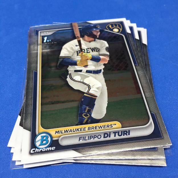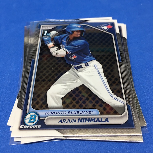 What's Buzz-worthy: My third and final one of these (for now) is one that again beat the odds -- one in 464 packs for that Blue Shimmer -- a well as included some top names for both rookies and prospects. For a blaster, this was solid though over the long run even basic cards might not be that valuable thanks to plenty of production and the sets not being that big. (A blaster case would include at least three Chrome cards of each card, for example, if the collation is clean.) More of everything made really pushes the parallels into being the sweet spot, though more parallels are definitely needed here atop larger set sizes if you ask me as those odds are, well, funky. (Make more variety, cough up more ... a larger set would still help balance it all out.) ... The design here is an upgrade over last year for sure -- big improvement over what felt like plain and typical photo framing. ... Retail is the home of some exclusive Green parallels and can include autographs (none for me in any of mine) while these boxes can include a number of possible finds at longer odds, including Superfractors -- check the odds at the link up top.