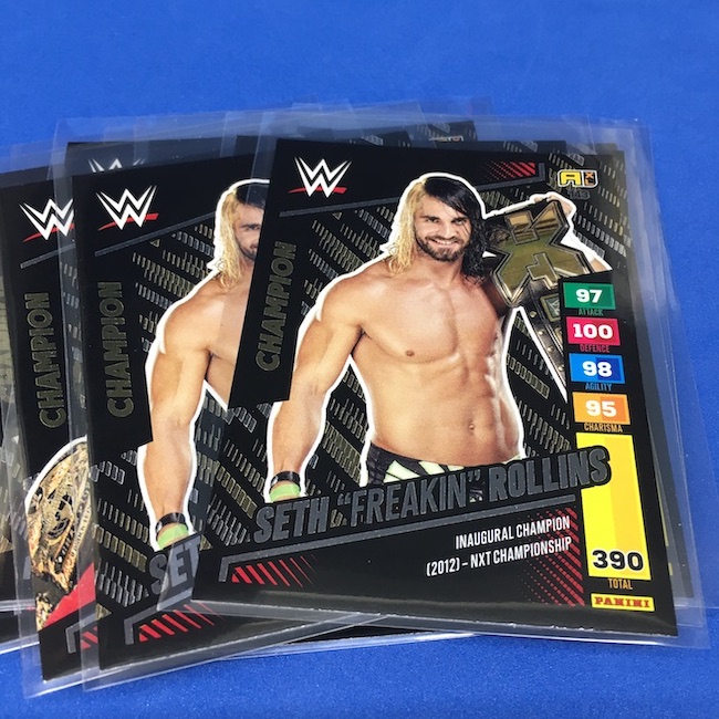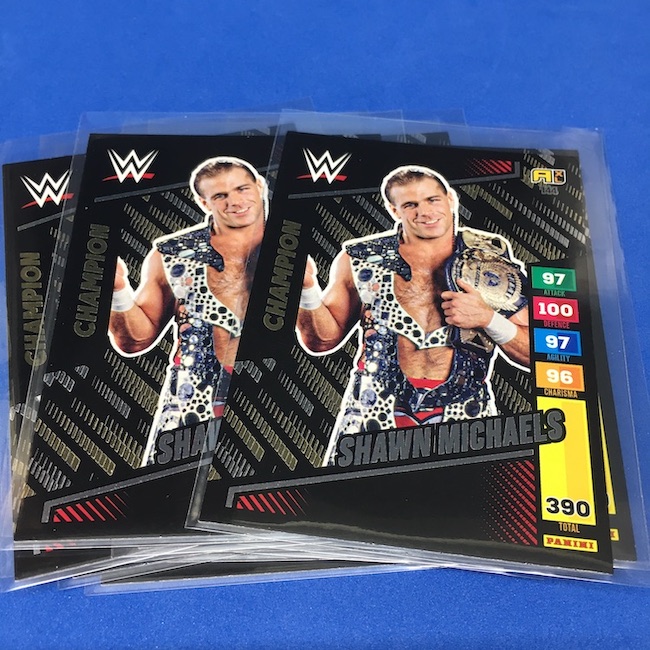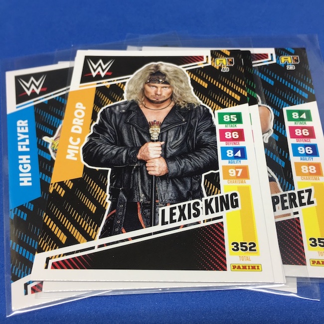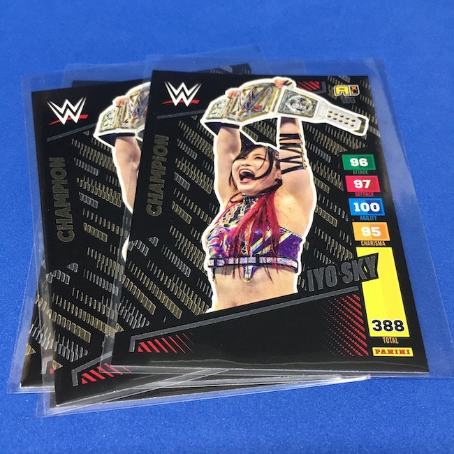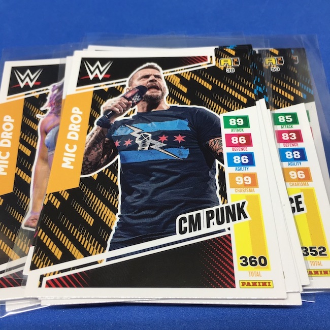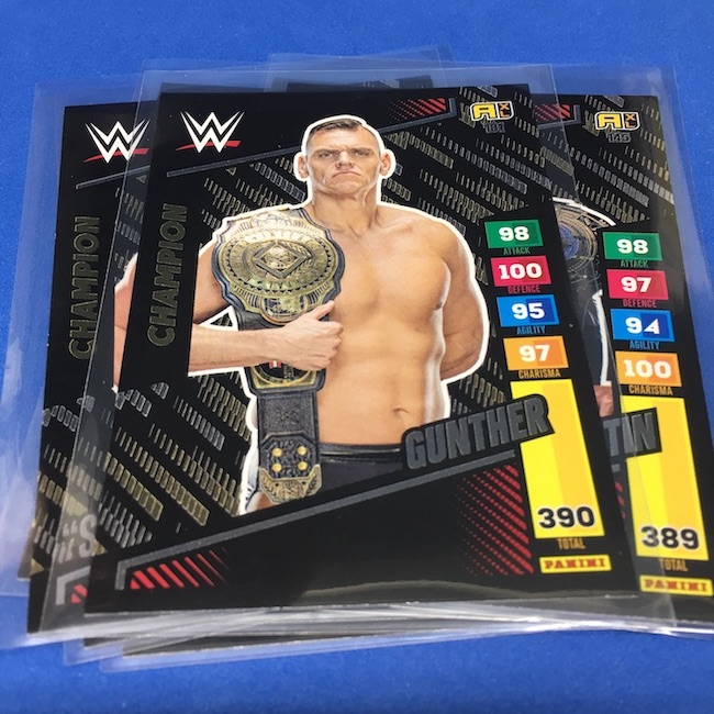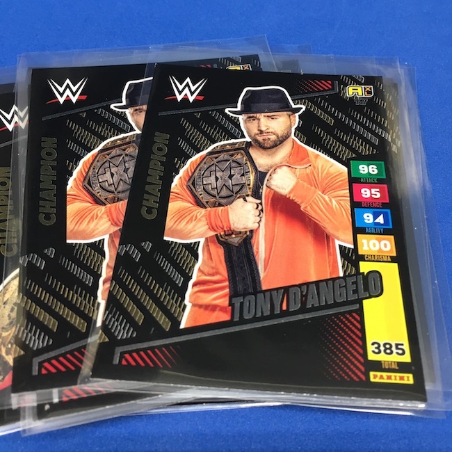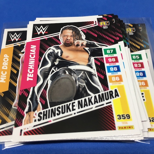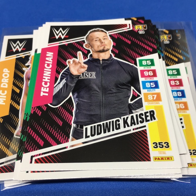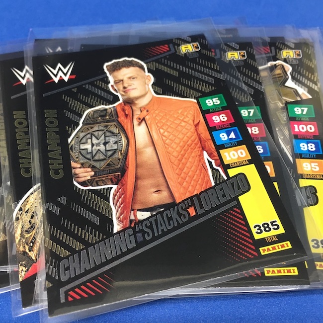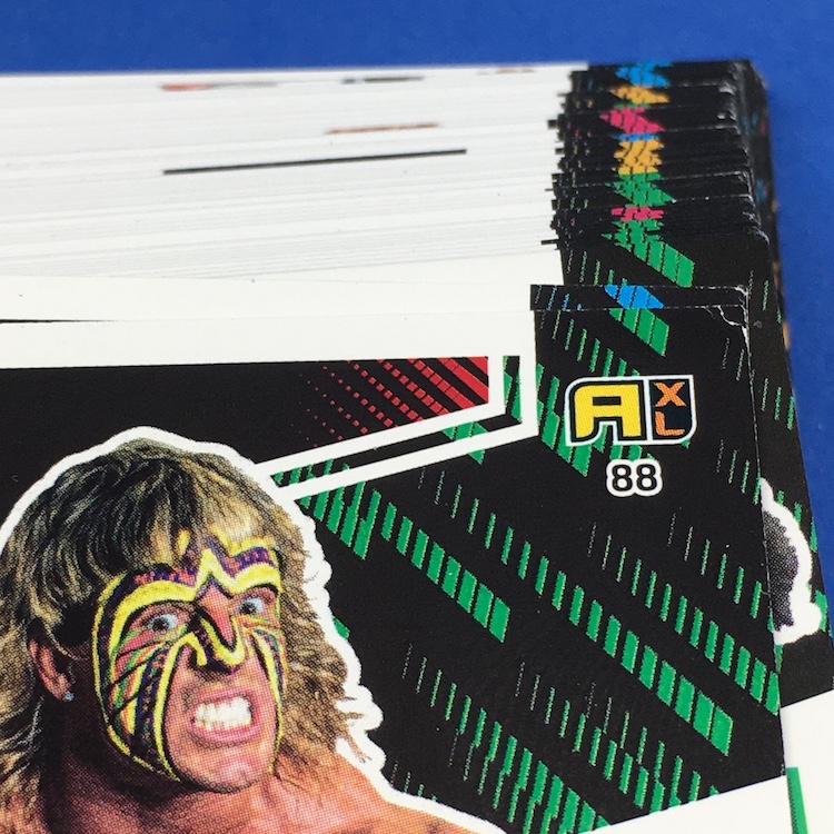 What's Buzz-worthy: This international Panini release is a simple one I bit on for a full box awhile back, but since I ran into condition issues left and right here this one has sat for a slower Buzz day ... but with an international WWE pay-per-view show set for tomorrow in Berlin making this one feel right here we are. What is this? It's a gaming release that's a bit no-frills but one that has some strong photo selections but some rough, rough, rough stock issues, particularly on corners of pretty much every card from a combo of either stock/cutting or packaging. Pretty much every card has a clumpy or even torn back corner where things went awry -- sometimes on all four -- and if that's not the case it can also happen on the fronts, though the foils can be moderately cleaner. If you're a collector not sweating the condition, this a solid little set you can collect for sure but I went this route in hopes of finding some clean copies for a few names I collect with an eye on grading. I still might on a couple -- I like the looks of the cards here that much -- but anything above an eight might be a miracle. What's in this? The breakdown is on the wrapper -- 30 Technician, 30 Powerhouse, 30 Mic Drop, 30 High Flyer and 30 Champion cards -- and that's it. The light stock here combines with dark backs and then the issues ... it's not flashy but they're perhaps first made to be played more than graded. I like this one with its look and checklist debuts ... if it gets really cheap, I'll probably rip some bulk looking for grading unicorns of names I like while perhaps grabbing some more singles on the cheap but that may not be do-able. This would have been a nice thick-stock or even Prizm release.