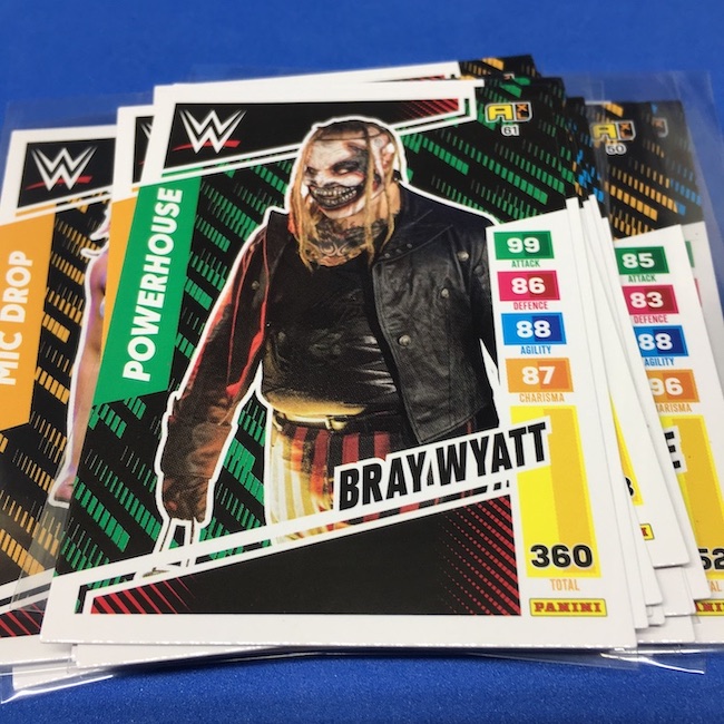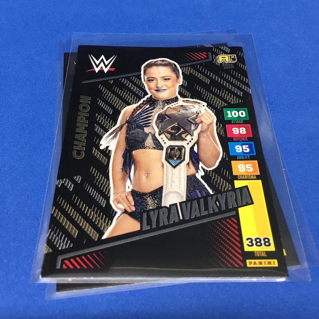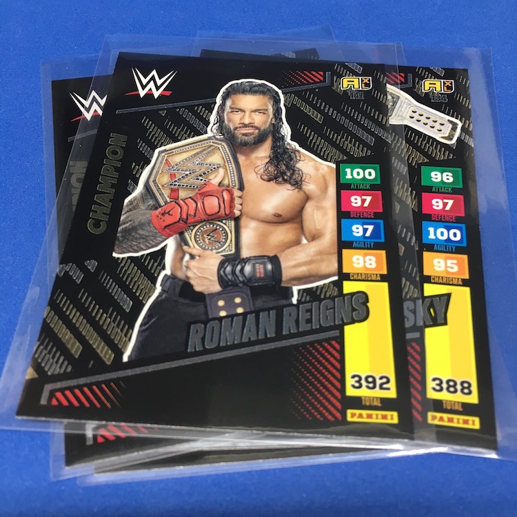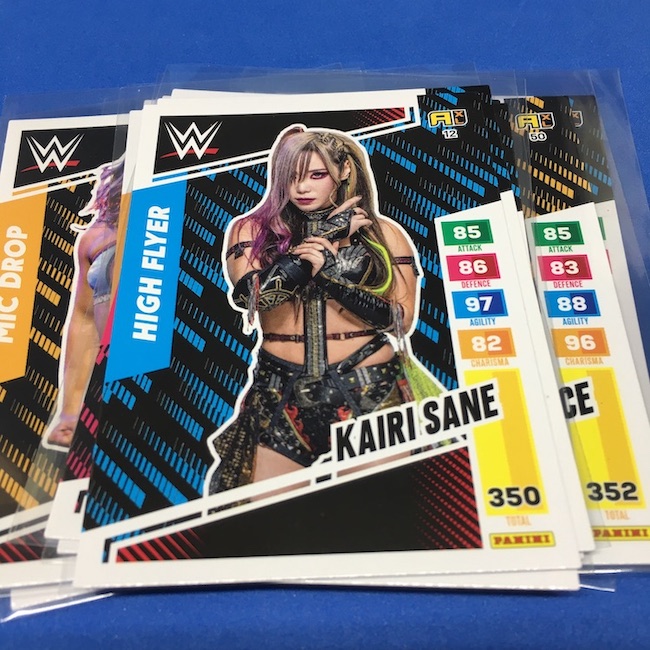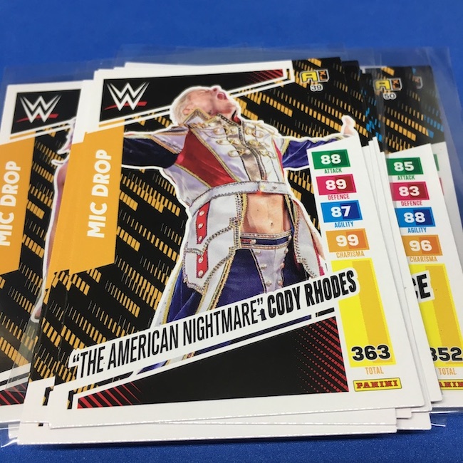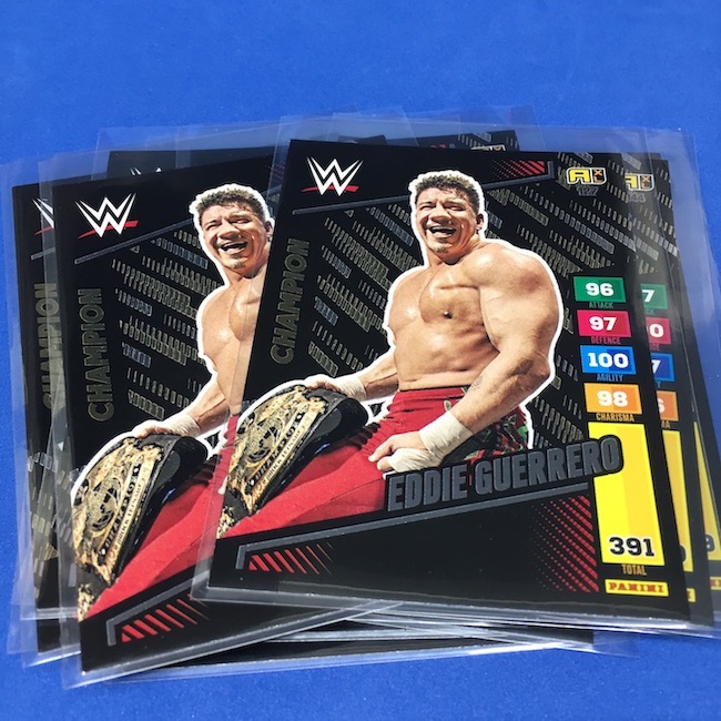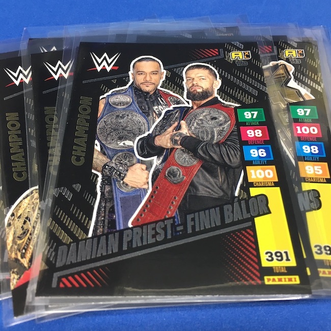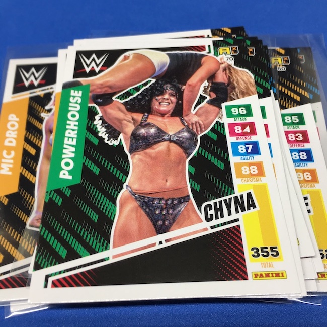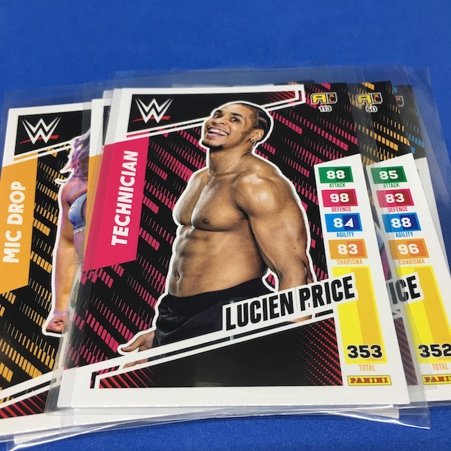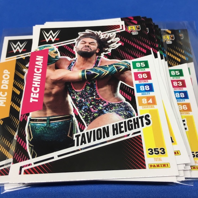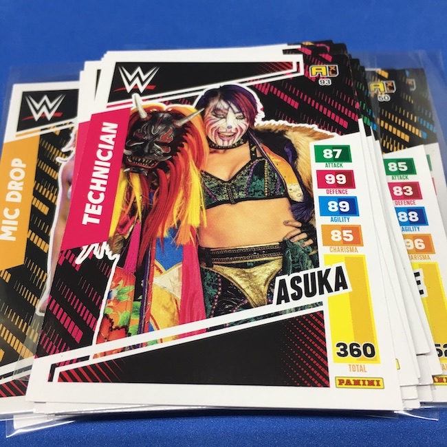 What's Buzz-worthy: This international Panini release is a simple one I bit on for a full box awhile back, but since I ran into condition issues left and right here this one has sat for a slower Buzz day ... but with an international WWE pay-per-view show set for tomorrow in Berlin making this one feel right here we are. What is this? It's a gaming release that's a bit no-frills but one that has some strong photo selections but some rough, rough, rough stock issues, particularly on corners of pretty much every card from a combo of either stock/cutting or packaging. Pretty much every card has a clumpy or even torn back corner where things went awry -- sometimes on all four -- and if that's not the case it can also happen on the fronts, though the foils can be moderately cleaner. If you're a collector not sweating the condition, this a solid little set you can collect for sure but I went this route in hopes of finding some clean copies for a few names I collect with an eye on grading. I still might on a couple -- I like the looks of the cards here that much -- but anything above an eight might be a miracle. What's in this? The breakdown is on the wrapper -- 30 Technician, 30 Powerhouse, 30 Mic Drop, 30 High Flyer and 30 Champion cards -- and that's it. The light stock here combines with dark backs and then the issues ... it's not flashy but they're perhaps first made to be played more than graded. I like this one with its look and checklist debuts ... if it gets really cheap, I'll probably rip some bulk looking for grading unicorns of names I like while perhaps grabbing some more singles on the cheap but that may not be do-able. This would have been a nice thick-stock or even Prizm release.