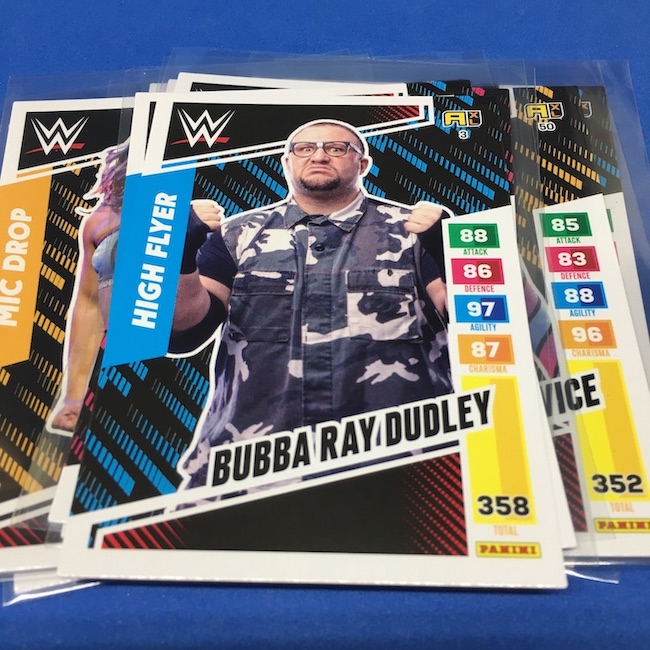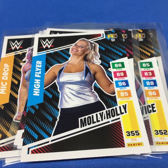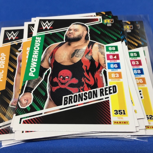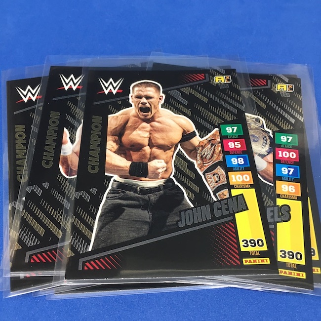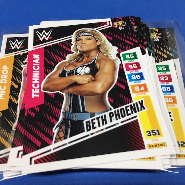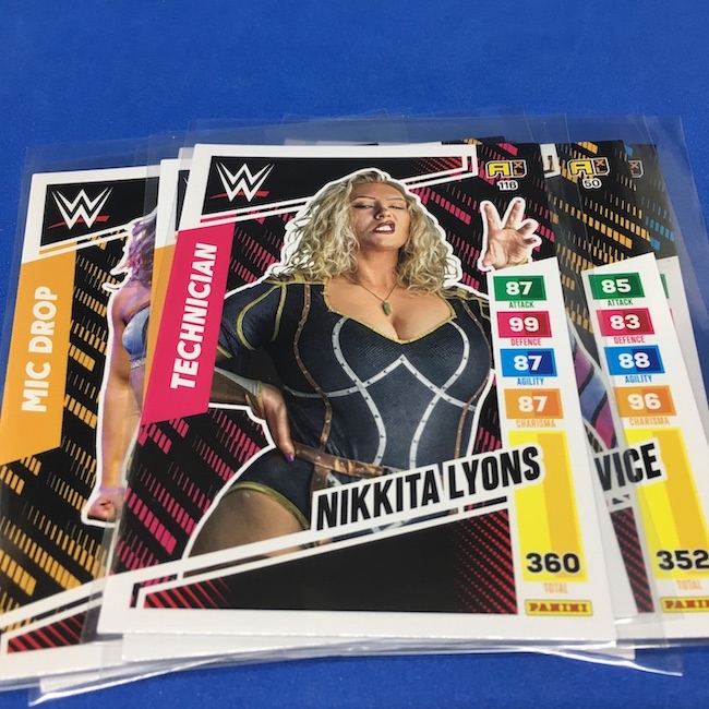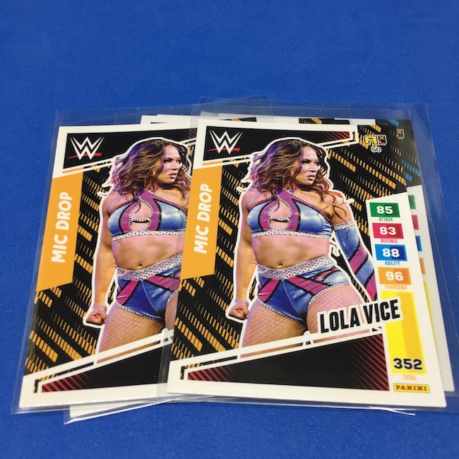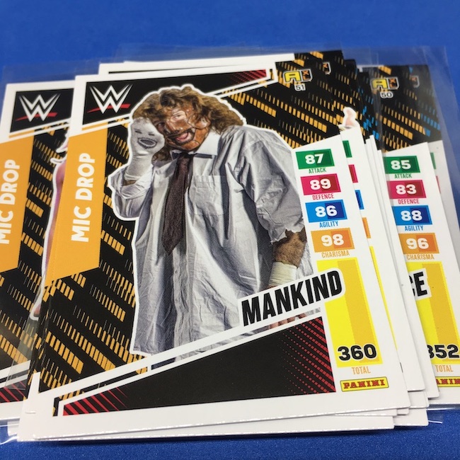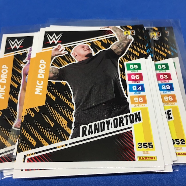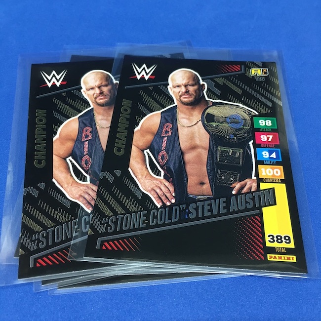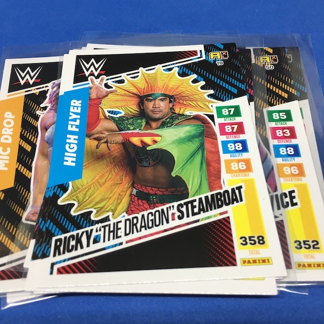 What's Buzz-worthy: This international Panini release is a simple one I bit on for a full box awhile back, but since I ran into condition issues left and right here this one has sat for a slower Buzz day ... but with an international WWE pay-per-view show set for tomorrow in Berlin making this one feel right here we are. What is this? It's a gaming release that's a bit no-frills but one that has some strong photo selections but some rough, rough, rough stock issues, particularly on corners of pretty much every card from a combo of either stock/cutting or packaging. Pretty much every card has a clumpy or even torn back corner where things went awry -- sometimes on all four -- and if that's not the case it can also happen on the fronts, though the foils can be moderately cleaner. If you're a collector not sweating the condition, this a solid little set you can collect for sure but I went this route in hopes of finding some clean copies for a few names I collect with an eye on grading. I still might on a couple -- I like the looks of the cards here that much -- but anything above an eight might be a miracle. What's in this? The breakdown is on the wrapper -- 30 Technician, 30 Powerhouse, 30 Mic Drop, 30 High Flyer and 30 Champion cards -- and that's it. The light stock here combines with dark backs and then the issues ... it's not flashy but they're perhaps first made to be played more than graded. I like this one with its look and checklist debuts ... if it gets really cheap, I'll probably rip some bulk looking for grading unicorns of names I like while perhaps grabbing some more singles on the cheap but that may not be do-able. This would have been a nice thick-stock or even Prizm release.