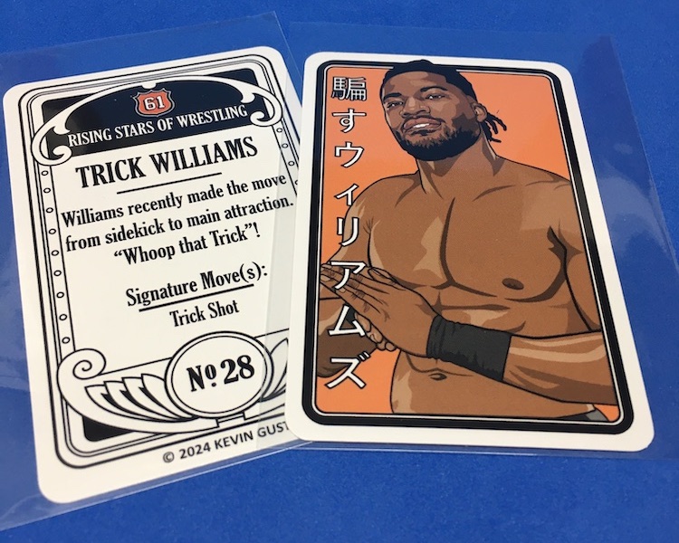 What's Buzz-worthy: What is this? It's the third release in a series of artist-created indy wrestling card sets that spotlights a number of young stars and newcomers among several companies with a little extra chase element in there, too. Only 150 sets were made for this series with two chase cards per set and then an extra card for buying a pair of sets. (To spark sales, the first 61 sets bought landed three cards -- I was too late for that -- while the final 50 only get one extra per set.) I have done each of these sets (the first two are in past Buzz Buys roundups -- here for 2022 and here for 2023) but since it's almost been a month since my last wrestling Buzz Break (How?!?) I figured I'd pop this new release up here today. This edition of the base set has a number of key names -- only one name I wasn't familiar with -- and a few so new to NXT they have very little cardboard if any at all. My variations show the full rainbow of potential finds here, too. These illustrations showcased in a Japanese menko design are crisply done and the printing and cutting is immaculate, too. These were an easy grab at their price and I like the bonuses that come with them, too. I picked up a different set tangentially related to these (similar style) and will likely Buzz Break them here, too, at some point ... this was the new arrival so it won the coin flip for today. All in all, I like the feel of these and I'll be a regular buyer while they're done. Why? They're affordable and crisply done and the continuity of them helps make it all a little more collectable. They're a win ... simple as that.