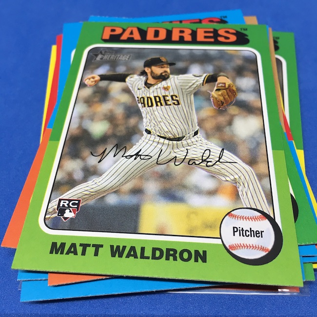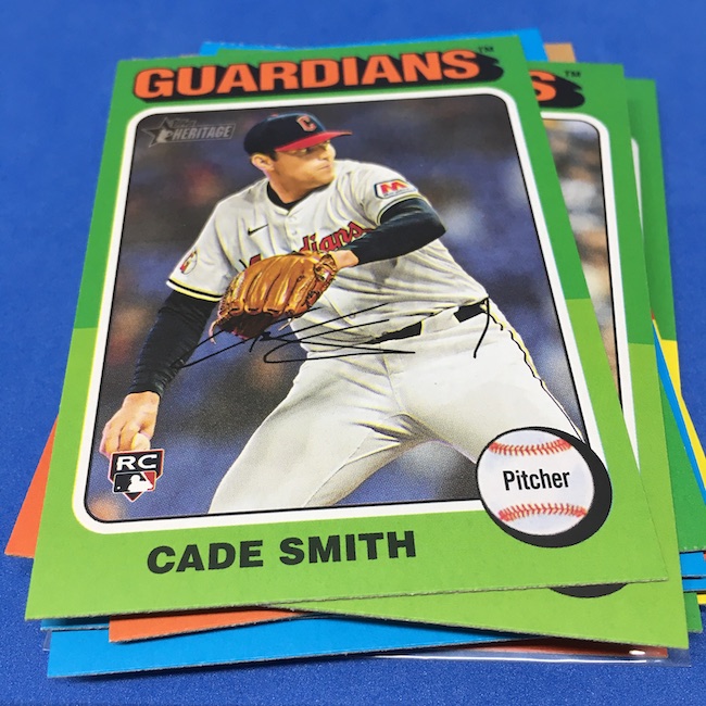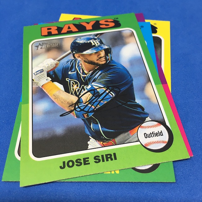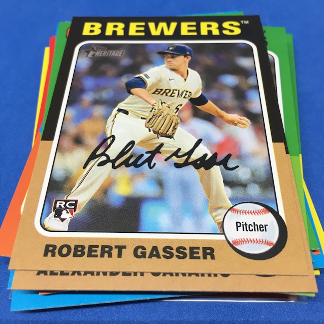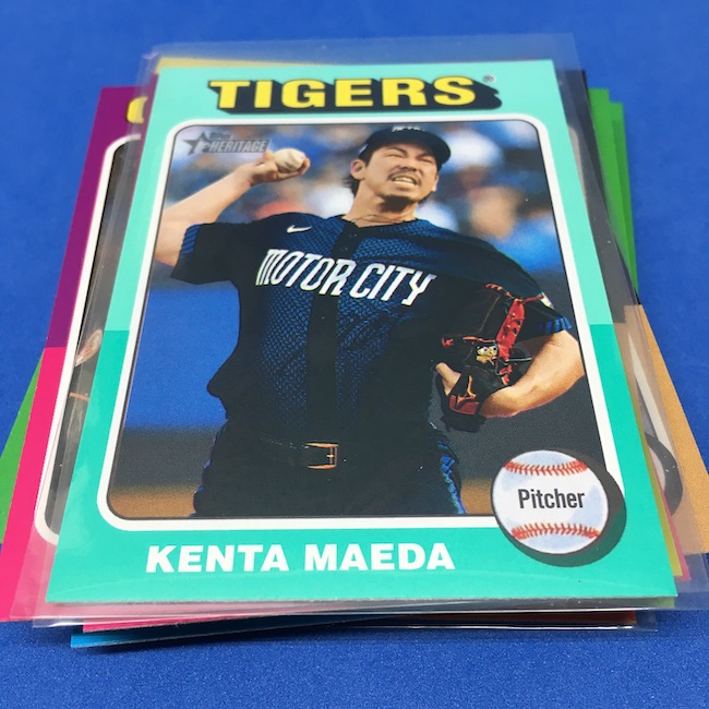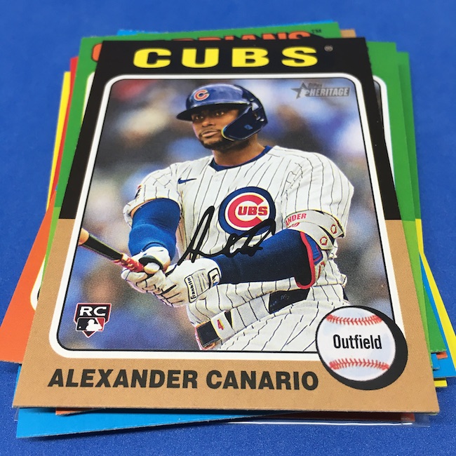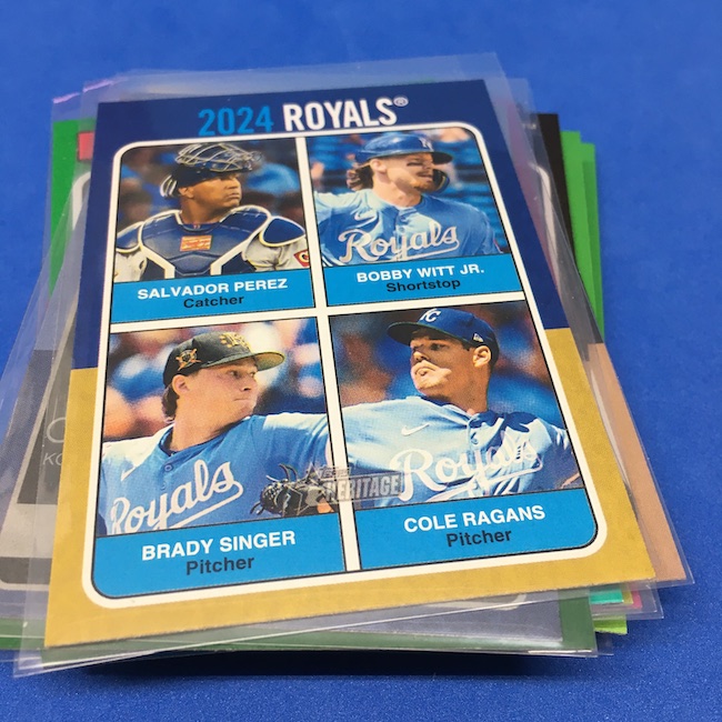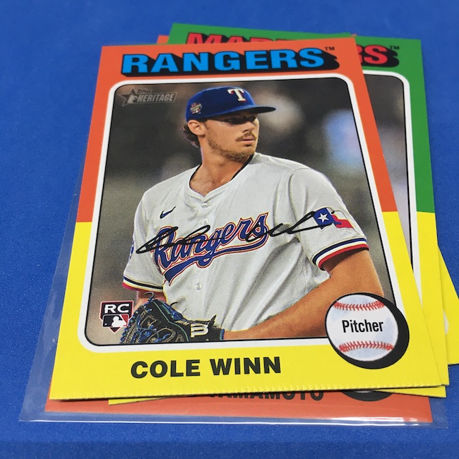 What's Buzz-worthy: My third box here delivered essentially average or worse but was saved to some degree by the Yamamoto and maybe a couple cards among the inserts ... but it's definitely the worst of my trio. So ... not all blasters are over-delivering. The volume of cards stuck in the wrapper seal like several I've seen in all three of my blasters (at right) was at least not as bad this time -- only a few got that unintentional botched-parallel treatment. ... As noted last time, this months-late arrival caps the 2024 take on the colorful 1975 Topps set and was perhaps worth the delay. It's improved with an array of parallels added to the mix in this format along with an expanded Chrome presence (all cards Chromed save for the 100 in the first series) atop the rookie-dense lineup that catches up on all the notables of last season working out their sophomore kinks now. ... There's a lot to be found here across its formats -- just hobby and blasters -- with long odds so a lot was made. That said, the Chrome shift here means more Superfractors here than in any Heritage release ever made and the strong rookies will help those be even bigger finds at times, though it also means more common Supers, too. (It's one in 4,500ish and up in all formats.) About the only bummer is how the Minis here for just this release are one in 30 packs after being a standalone release of their own -- you'd think they could have flowed more regularly here -- if not even one per pack -- to be collectable and not a dollar chase since the first series was a full release. (No Mini parallels here, either.) There's a lot to find but I may wait for prices to settle -- if they do -- as the odds on bigger stuff are long in all formats. I'll dabble with the smaller format here, conceding the hit per box (autos are roughly twice as tough in retail, while standard Relics are slightly easier ... hobby has more variety on that front) for the basic stuff here will be easily found later. Why? It's only 200 cards in a base set -- you'll land just under one set per hobby box and you get about a third of a base set in a single blaster ... that's a lot of every player here and all the notable RCs are among the basic part of the set and not the SPs. They should get more affordable over time, while the rarer stuff could be steeper as the odds are longer within a meaty print run.