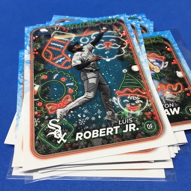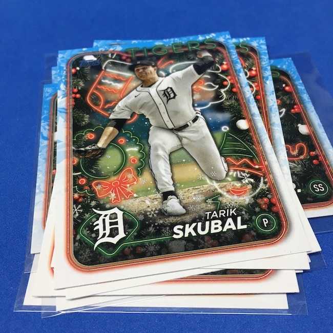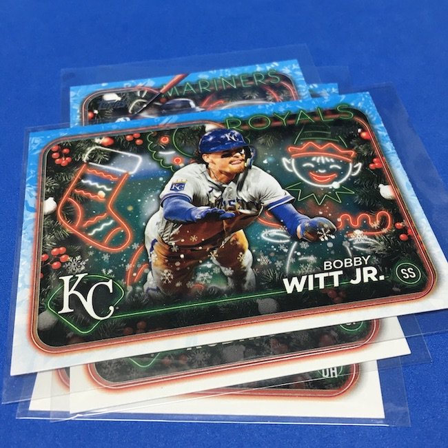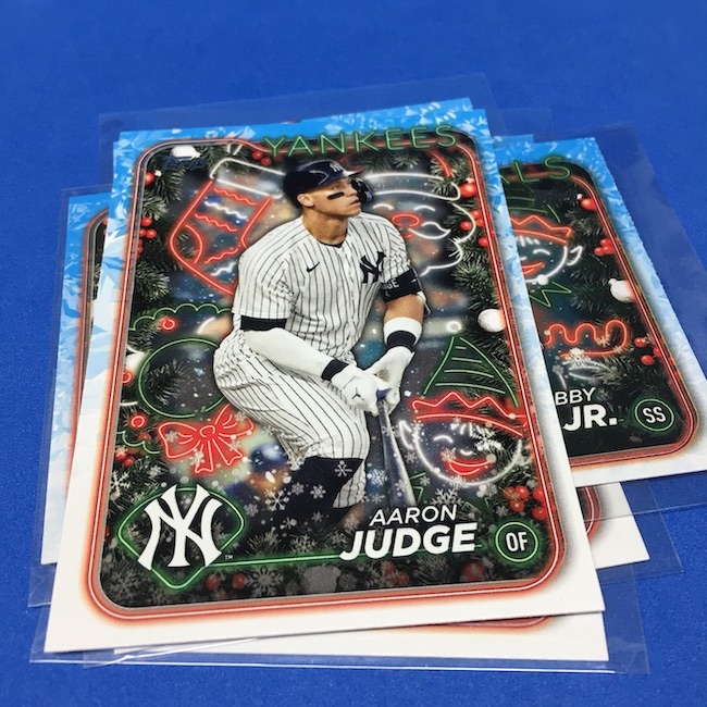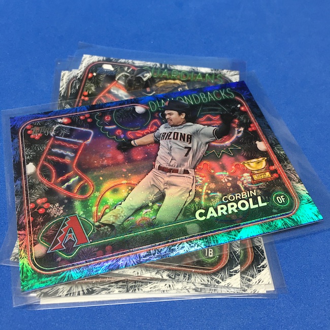 What's Buzz-worthy: There's nothing subtle about this one and its theme ... and that's probably why a three-pack turned into six-pack of tins here for December Buzz Breaks. My last one was a solid A-grade tin and perhaps should have been an A+ but this one also is very strong ... but not as good as last time. My rookies here are not as good at all while my biggest parallel card last time (Elly De La Cruz) was replaced by a Corbin Carroll this time. An upgrade is Ohtani as a variation ... so that's a plus here but still perhaps not as strong as last time for the pack overall. ... You get a variation in every tin and the ornaments are one in three. There are other parallels of the Trees here and that's about the only chase other than the variations. (Hits are in the boxes every time.) ... The design is a little heavy here but since my flagship buying was easily at an all-time low this year between all three series this one offers up a chase for stars in a more concentrated form with a quarter of the base set in every tin.