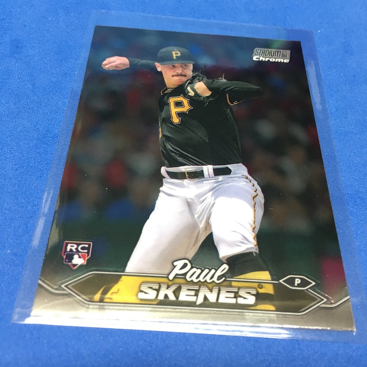 What's Buzz-worthy: This one started off strong with the Skenes Chrome in its first pack ... but then things got weird. Check out the run of base cards ... note the teams from card to card. That's only seven teams in 25 cards. The inserts? Better ... but half of the Red parallels were Twins as was one of the Chromes. That streakiness could have paid off well with other teams but at times it wasn't bad here ... but it's also just not good here. The inserts included a few types of cards not found in every blaster -- statistically one in three or four here on a couple cards -- but ultimately nothing out of the ordinary yet with some good players attached. That and the Skenes helped this box avoid a lower grade with its collation issue. I think there's a good lineup of stuff here -- especially among the rare finds more likely to land in hobby -- but beyond more insert volume it seems like this format is again a bit forgotten as big, rarer finds are added to brands but little things that make the smaller boxes mundane or lacking at times across the board this year. An example? No box-topper here. A simple add ... gone. Not a biggie but that was something in recent years to find, too, that might make a rough box better. The design has a late-1990s Pinnacle feel -- not sure if that's a compliment yet or not -- while the washout of color for the parallels is jarring, though perhaps better than recent years where you could barely tell differences. (Parallels should be obvious ... but washing out the backgrounds takes away from the photos.) The cutting and stock still had some issues this time but was perhaps cleaner than recent years for this brand and maybe even for other brands this year. Still could be better. All in all, this one remains one of the more-collectable brands for a fan or beginner who doesn't have the cash to spring for hobby boxes in bulk and still could find something of note without irresponsibly clearing a shelf -- there needs to be more of that. Ink is possible here, though a bit higher odds than retail in some recent years ... but at least it's still in there. The Chrome presence here was better than in past years -- a plus but there are collectors may not like a lot of Chrome so it splits the difference, giving both camps what they like. I'll offer up more thoughts when I rip more ... it'll get at least one more look from me.