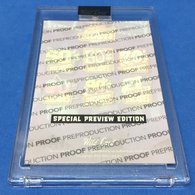 What's Buzz-worthy: I'm on a heater ... my fourth pack here revealed my fourth 1/1 card in a row -- this time once again with the autograph box where, well, no ink this time but ink can be found in this release. Presley isn't a stranger to cardboard appearances between acting and her life with Elvis Presley, but this one was perhaps my oldest-era find for pop culture in terms of being off the modern radar. Not a bad thing -- I just landed newer names before this rip. Had this been ink, it would be a big card -- she's got a nice 'graph where you'll see every letter -- while this one just carries the big white box spot for it. ... If you missed my previous breaks, I'll revisit some of my thoughts now. ... This previews what looks to be an interesting release to come later this year with each encased preview card limited to no more than 10 serial-numbered copies. In play are a ton of colors and textures -- and one box I saw opened had seven 1/1 cards as well as a 1/1 auto -- and there's a lot of stuff to be found. It includes standard card proofs, autographed card proofs (a big blank white box where ink goes like this one) and then some signed versions (one per box), some apparently rarer sketch cards and then other proofs. (Teasers noted pre-production and production cards ... so perhaps some names here won't make the formal release later but I couldn't really discern a difference online.) ... Some of the 50-plus notables on the checklist include Clint Eastwood, Al Pacino, Charlie Sheen, Chevy Chase, Chuck Norris, Geena Davis, Molly Ringwald, Ric Flair, Carmen Electra, Marisa Tomei, Uma Thurman, Floyd Mayweather Jr., Gisele Bundchen, Samuel L. Jackson, Natalie Portman, Sean Astin and Zoë Saldaña for starters. ... These are cleanly and crisply printed on what looks to be chrome or plastic stock with a lot of colorful, flashy looks and I'm ready to dig in on more for this one as well as the regular set ... TBD on all that once info is released. (Nothing yet.)
