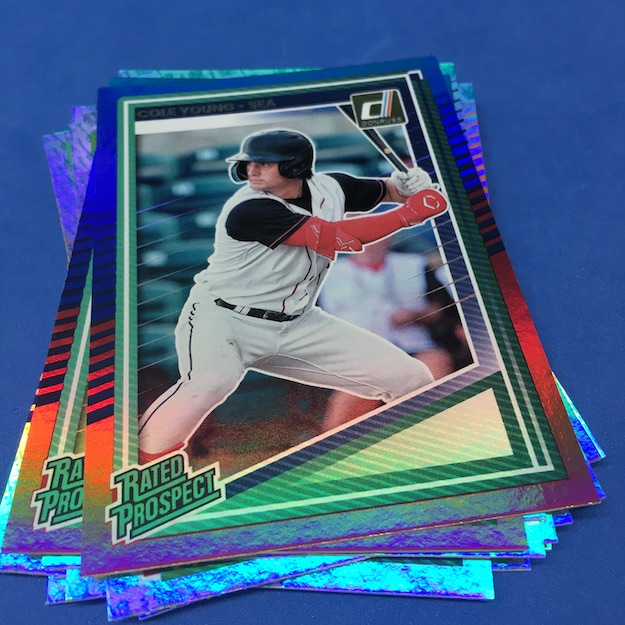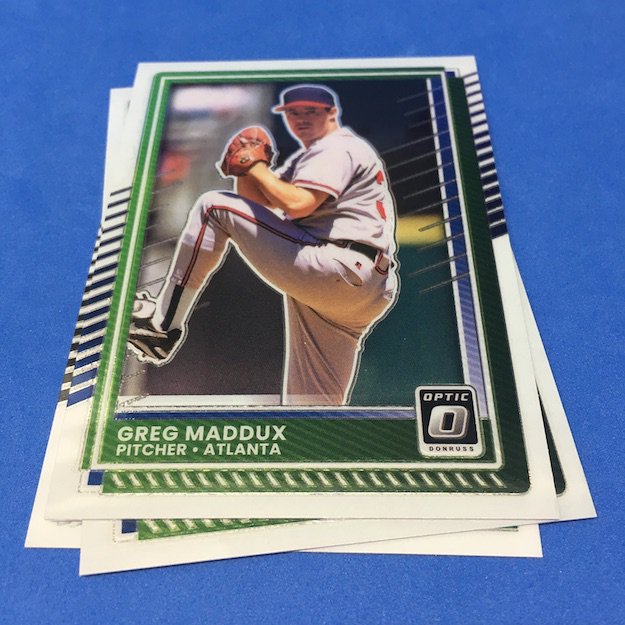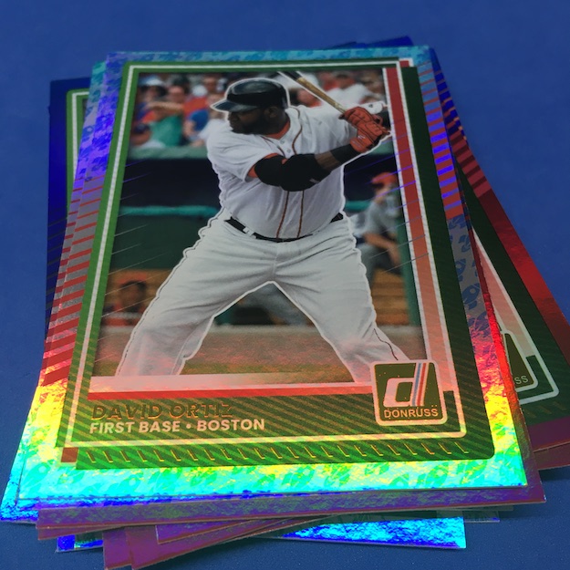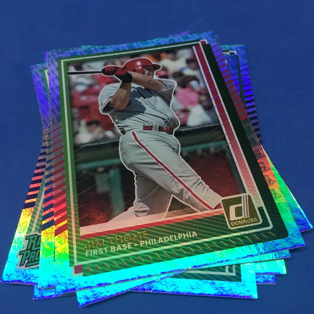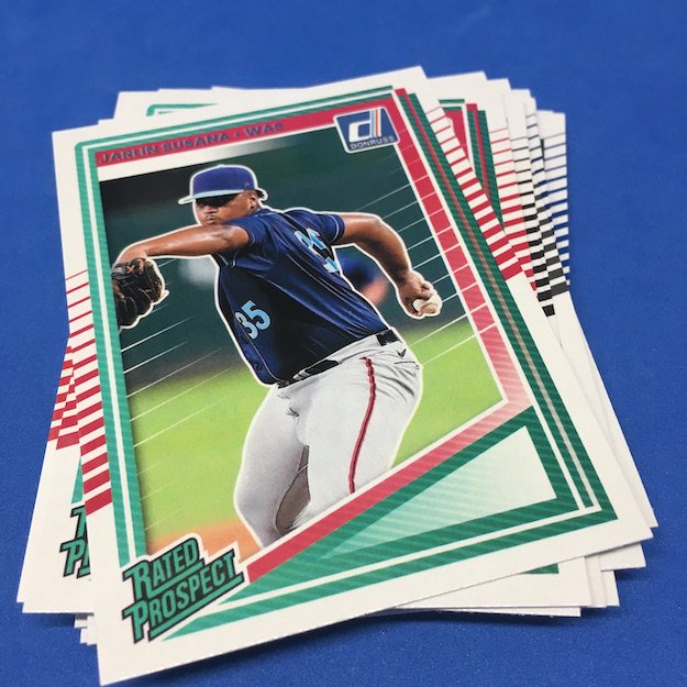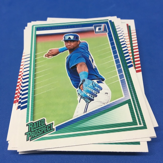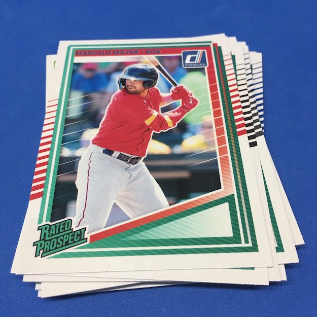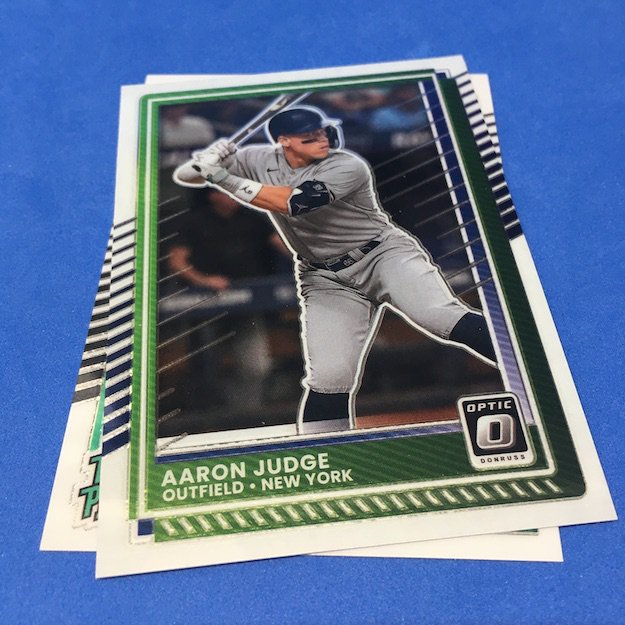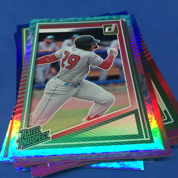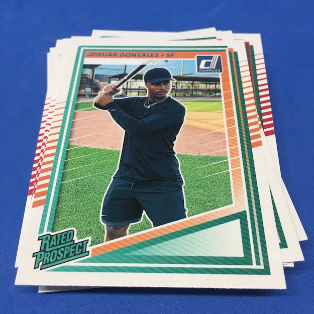 What's Buzz-worthy: This is an interesting mix with past, present and future MLB players all in here and on the same checklist. Technically, that would make a number of the Rated Prospects cards here Rookie Cards by definition as this clearly isn't a draft picks set and is still clearly from a major manufacturer -- the scope of the player lineup is the same as it would have been when Panini had MLBPA approval, just more active veterans back then. Fun debate for some who say they love to debate those things. (I've run out of time for more pondering of that today.) The pair of guaranteed hits here made this one of my better retail rips of the year, though, are there that many other retail boxes that even cough up two hits (autos or memorabilia) every time in 2025? That said, while I didn't land anything big there I'd still rather have them in there than not. This one is jam-packed with parallels -- probably too many -- but the mix of Optic and standard stock helped along with the colors and textures. The only things a bit lacking here were that lack of variety -- needs more inserts that aren't parallels -- and then some edge and corner issues that popped up here a little too often for my taste. It's not really rough on that front -- I have seen worse in recent years -- but still a little funky considering box prices these days. (I expect clean cards in the here and now.) The past and present dynamic is, to me, a good one with fewer commons who aren't established stars, Hall of Famers or players with future potential. Many players here are Hall of Famers and the box bears that logo with some apparent licensing going on here on that front. (The commons of the future in this will be the rookies and prospects that don't pan out.) I liked this one a lot more than I thought I would ... there's a decent chance I might dabble here once again just for fun. Hobby boxes should also be considered if you like the looks of things. It's a heavy frame on the card design but not the heaviest in recent Donruss years -- and there are some other touches that add to the feel here.