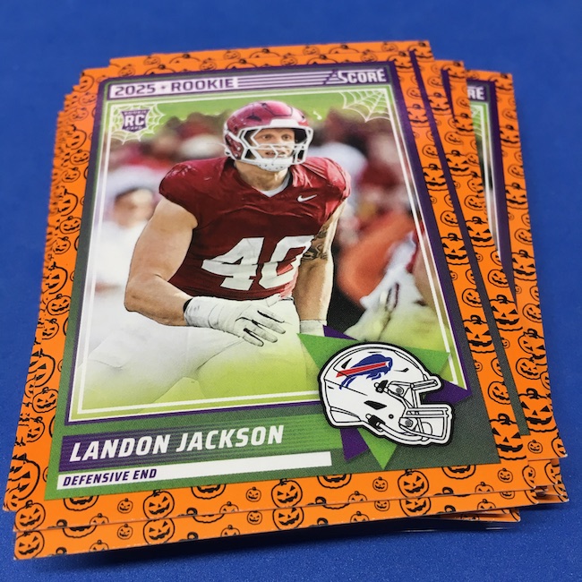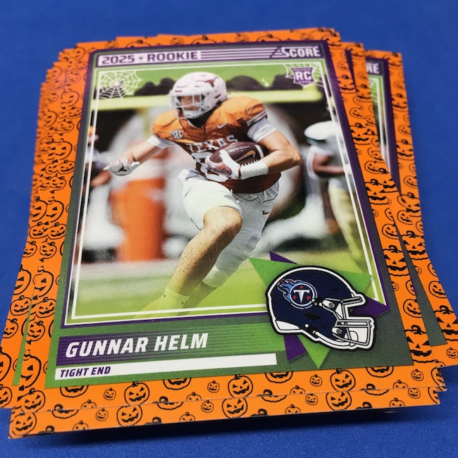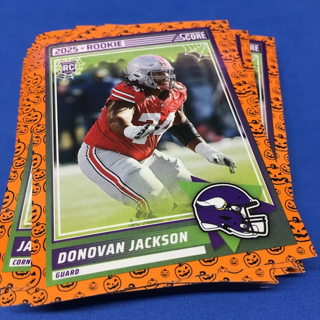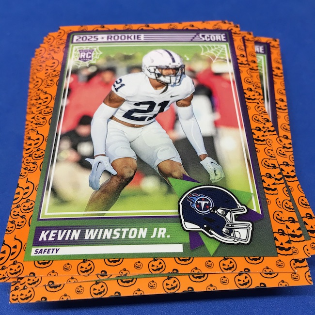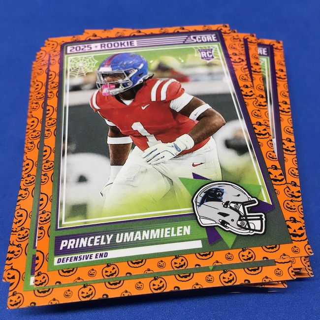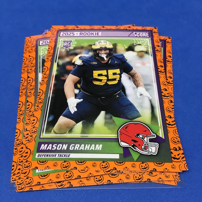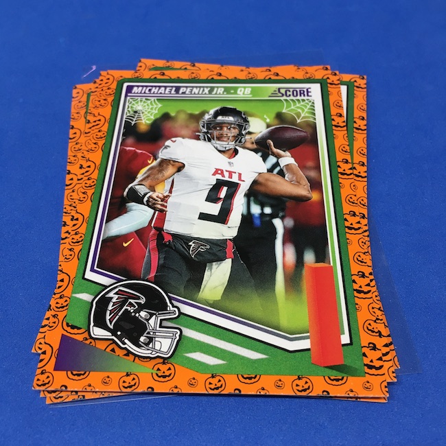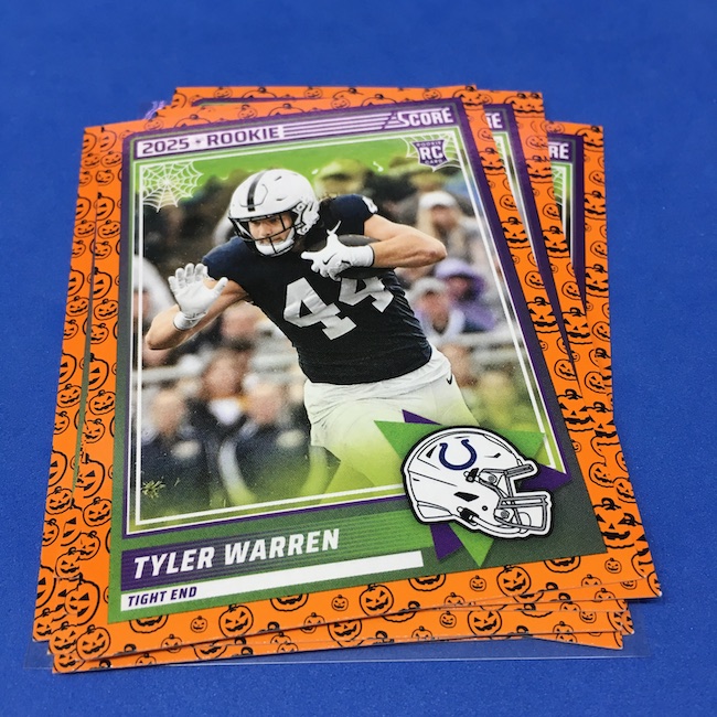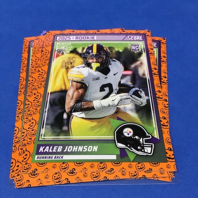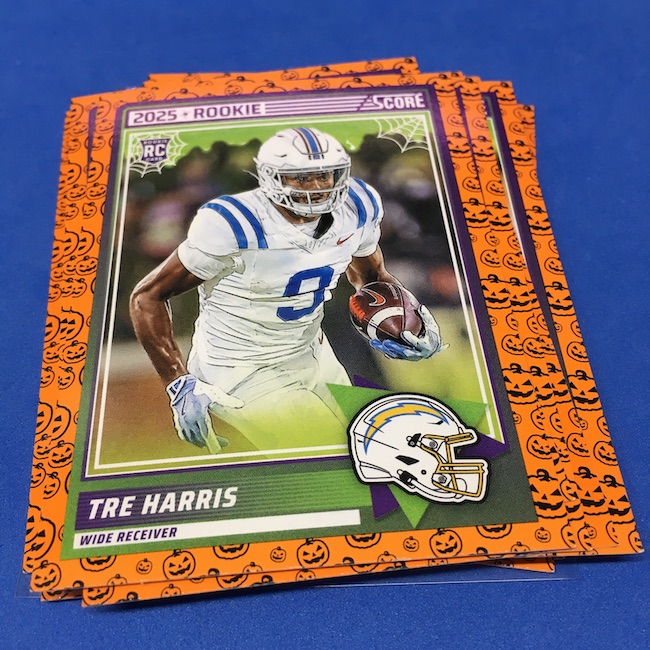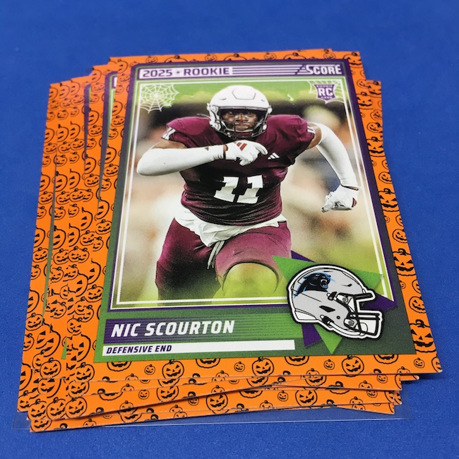 What's Buzz-worthy: My second and last tray of this one? A missing pack ... and that's atop the dramatic changes that made this one a lot less fun to even look at this year. So, with that said, here's what I said last time. ... This candy alternative for Halloween is, in some ways, dramatically different than last year, which will make this a dull break if you opt to open one of these $20 trays expecting a chase. Gone are a pair of set colors in every pack with everything here the same this time -- orange pumpkins -- while other parallels are now serial-numbered with three types. Those are Bats, Trick or Treat and Webs with the easiest /399 and the rarer ones /31. The issue? It's one in 125 packs for a parallel card -- or one in four boxes. Atop that, it's a 300-card base set and 100 rookies ... so your odds of a good name on a parallel are not easy if you do land one. What does that mean? Well, if you do land a good one you might get more for it ... but these boxes are not fun to open at all if you like any kind of variety. And, I guess, technically, this isn't one built for the traditional collector -- it's for Halloween -- but with box prices for even basic stuff like Score relatively pricey this kind of budget-minded rip alternative really isn't drawing me in at all like it should and did last year ... I suspect I might not be alone. A good thing here is that the cards are on the more typical Score stock and are glossed -- unlike last year's really basic feel. There being no chase in most boxes, well, that means you'll see just one more rip of these from me (I ordered two) and that's it until these hit the retail discount bin along with the candy in November. I'm not sure why the inserts needed to be numbered or rarer here ... and does that one extra step really cost so much that they need to be as rare as they are? This would be really fun with five or 10 parallel types and something from those seeded into every pack ... or even last year's approach with more numbered stuff added if they want to add value. I may not rip a lot of football going forward -- from any company -- as stuff like this just doesn't seem to make sense atop the here/coming licensing barriers of teams and players you may or may not find. Adding autos adds costs ... adding some parallel colors and sheets costs less. Rather than dabble, I may pick off singles that jump out at me but that puts this one in competition with anything and everything out there among the sea of singles ... meanwhile, this should be an easy "I'll try it" rip where I buy more than I should if I think it's reasonable that I'd find something, anything more than the basics. If finding any parallel of any guy is one in 125 packs, then I'll let you do the math for what it takes to find one of any of the 400 players found here.